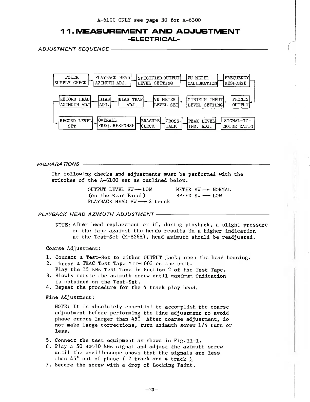 Teac A-6300 - 11. MEASUREMENT AND ADJUSTMENT -ELECTRICAL-; PLAYBACK HEAD AND OUTPUT LEVEL ADJUSTMENTS