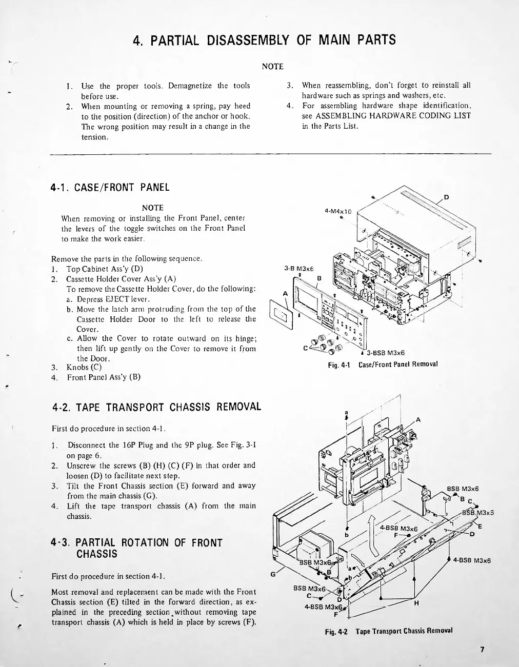 Teac A-650 - Partial Disassembly Procedures for TEAC A-650; Case and Front Panel Removal; Tape Transport Chassis Removal