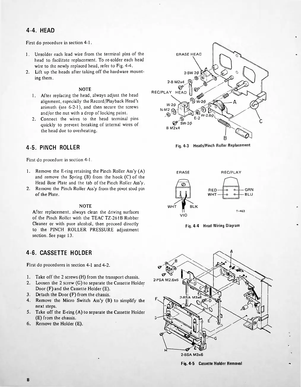 Teac A-650 - Component Removal Procedures for TEAC A-650; Head Removal and Replacement; Pinch Roller Removal and Adjustment