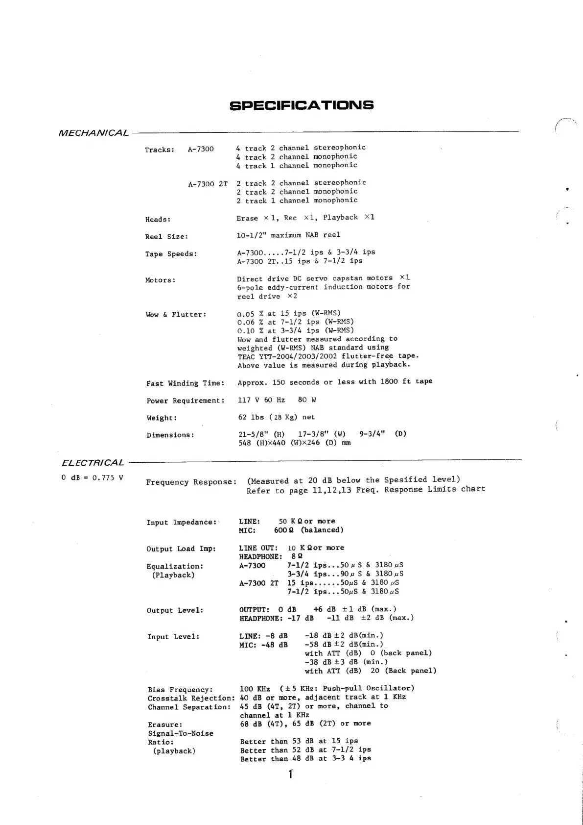 Teac A-7300 - SPECIFICATIONS; MECHANICAL SPECIFICATIONS; ELECTRICAL SPECIFICATIONS