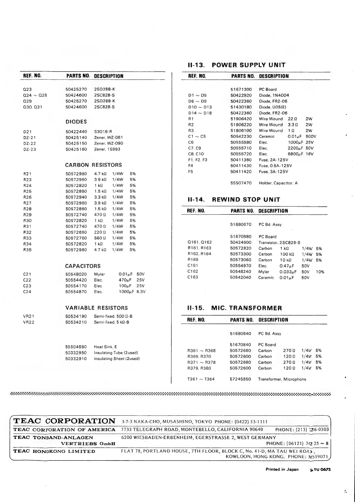 Teac A-7300 - POWER SUPPLY UNIT PARTS LIST; REWIND STOP UNIT PARTS LIST; MIC. TRANSFORMER PARTS LIST