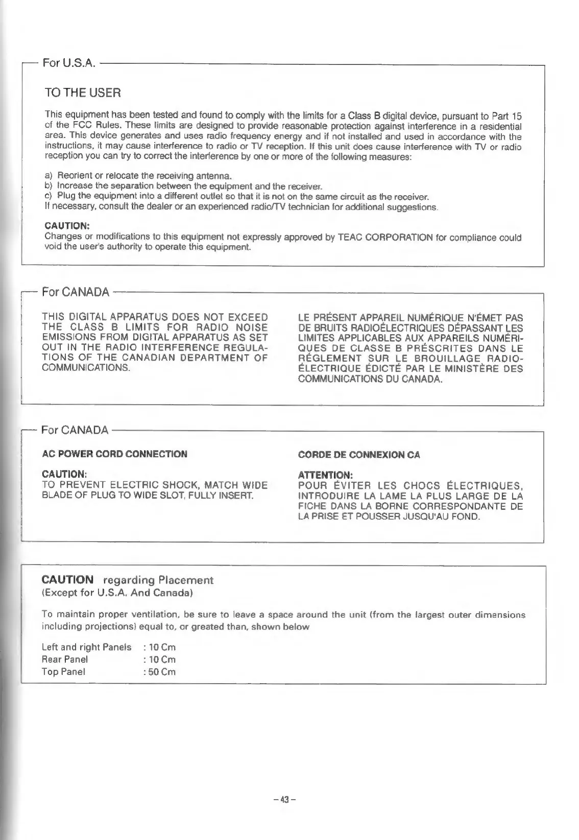 Teac A-H300 - Regulatory Information; FCC Compliance Statement (USA); Canadian Radio Interference; Placement and Ventilation