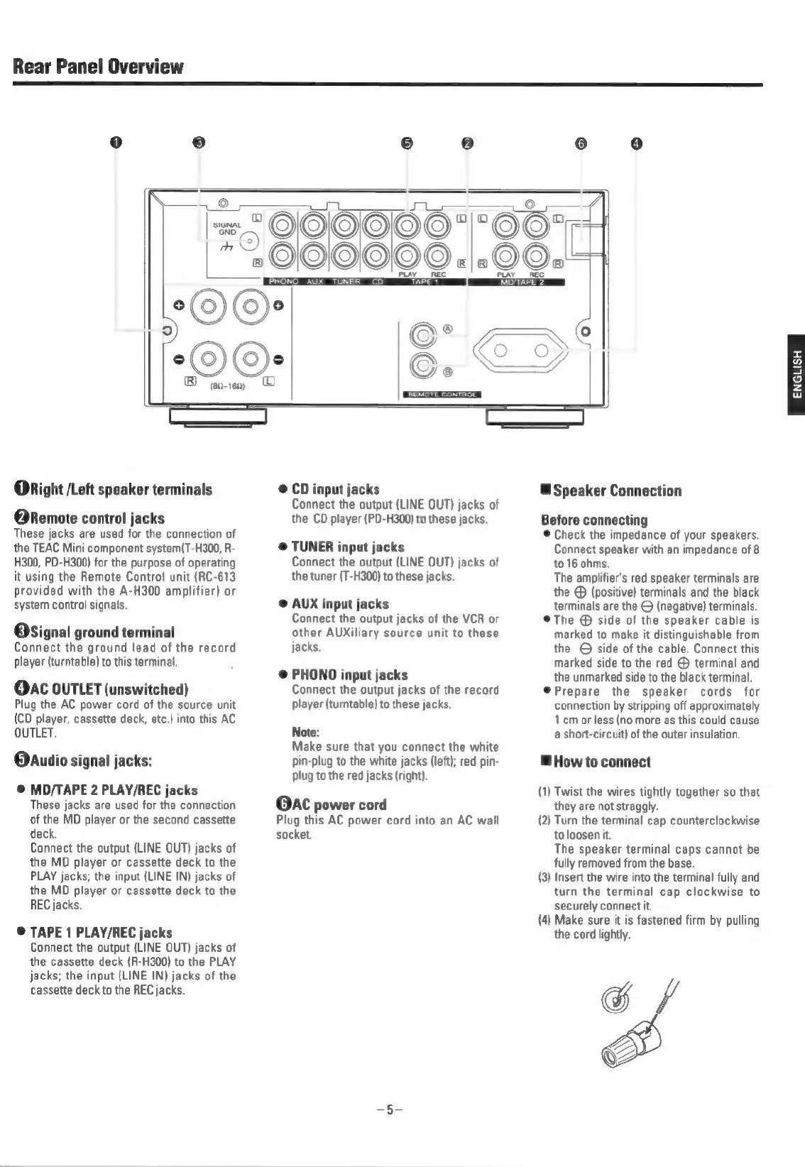 Teac A-H300 - Rear Panel Overview; Rear Panel Terminals and Jacks; Speaker Connection Guide