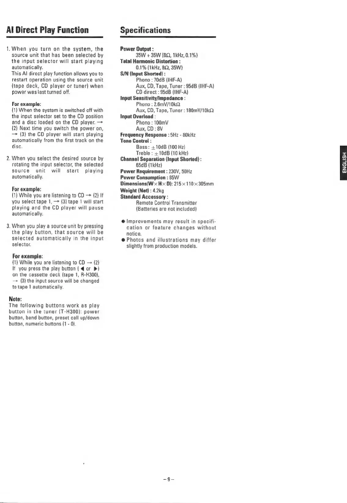 Teac A-H300 - Advanced Functions and Specifications; AI Direct Play Function; Technical Specifications