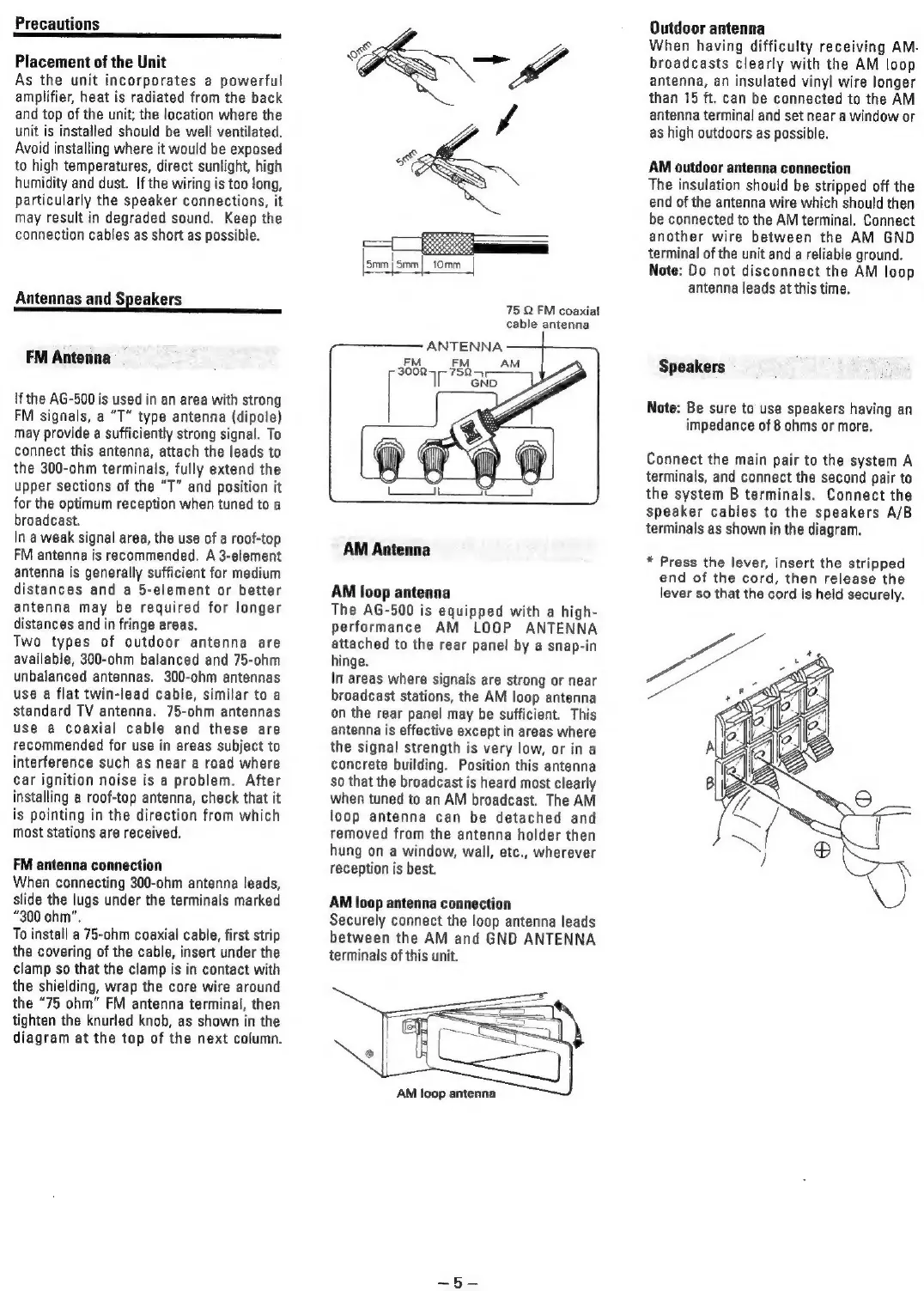 Teac AG-500 - Precautions; Placement of the Unit; Antenna and Speaker Connections