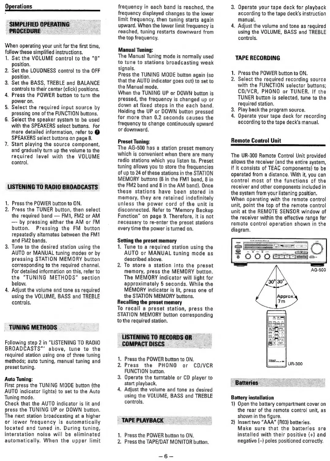 Teac AG-500 - Operations; Initial Setup and Basic Operations; Radio Reception; Audio Source Playback
