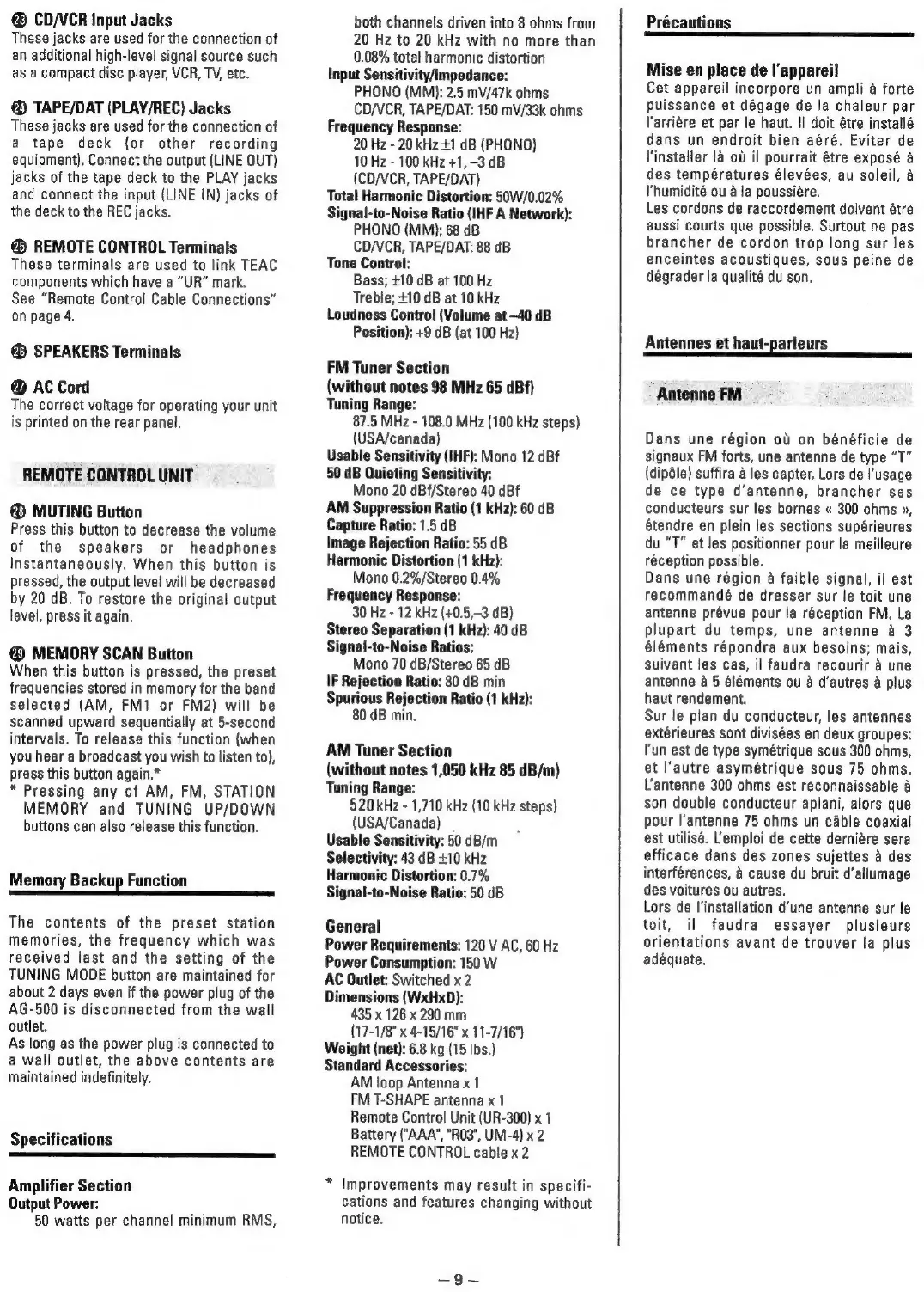 Teac AG-500 - Specifications; Amplifier and Tuner Specifications; General and Accessories