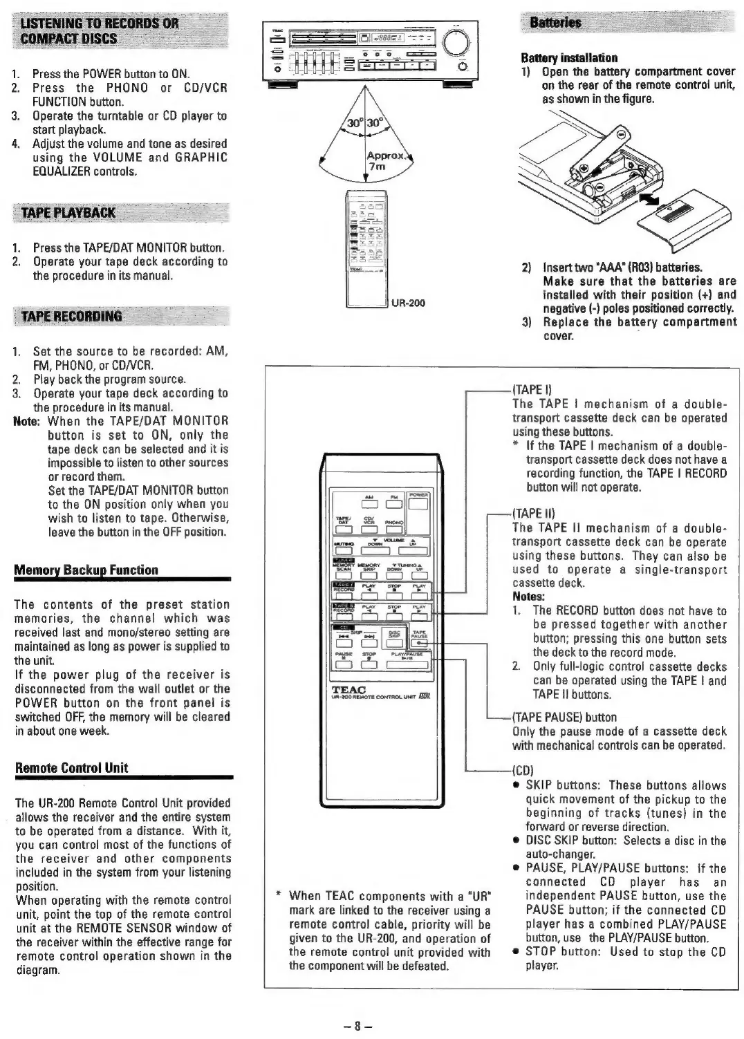 Teac AG-550 - Playback, Recording, and System Control; Playing Records and CDs; Tape Playback and Recording; Memory Backup Functionality