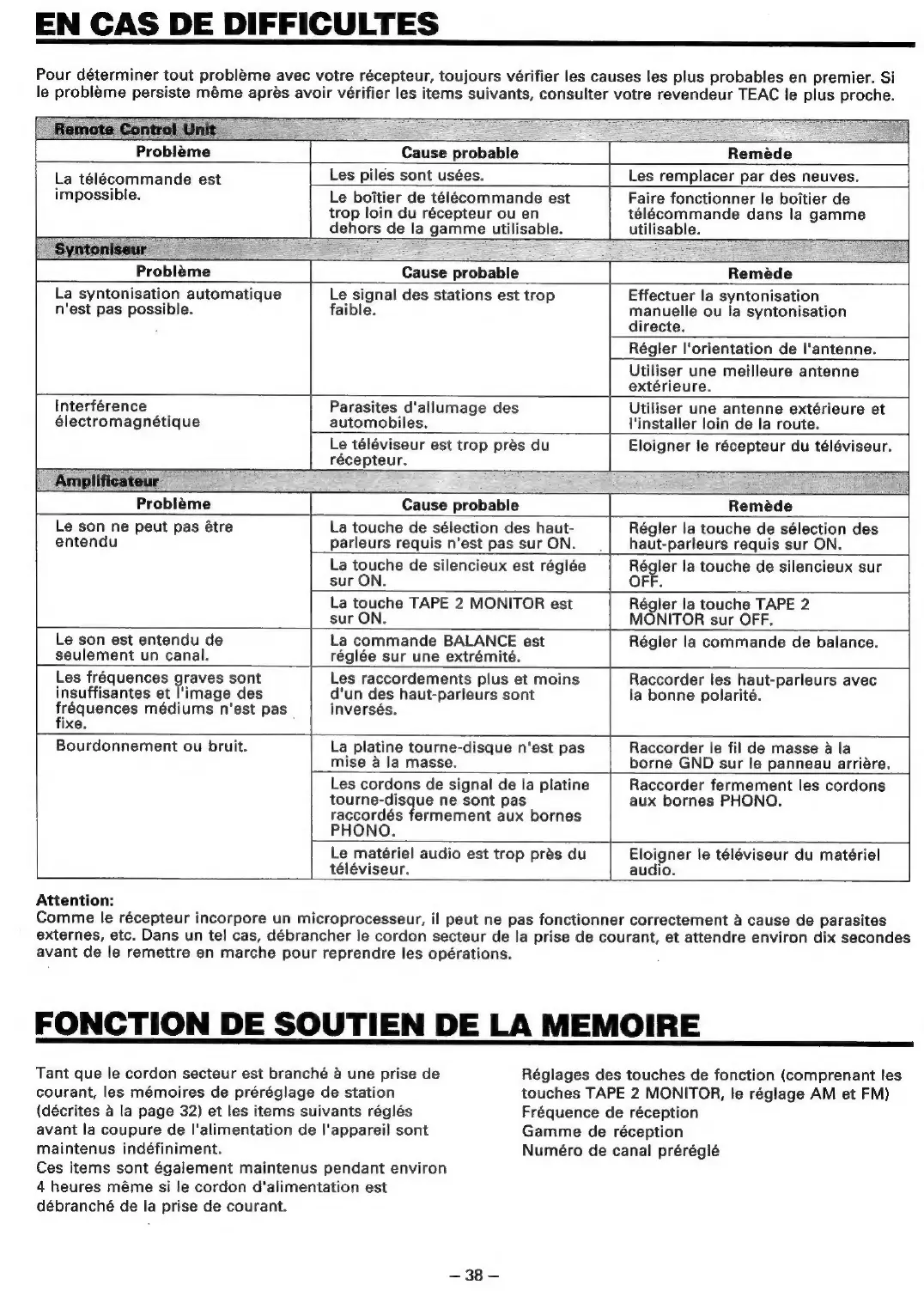 Teac AG-620 - Cas de Difficultes; Fonction de Soutien de la Memoire; Attention