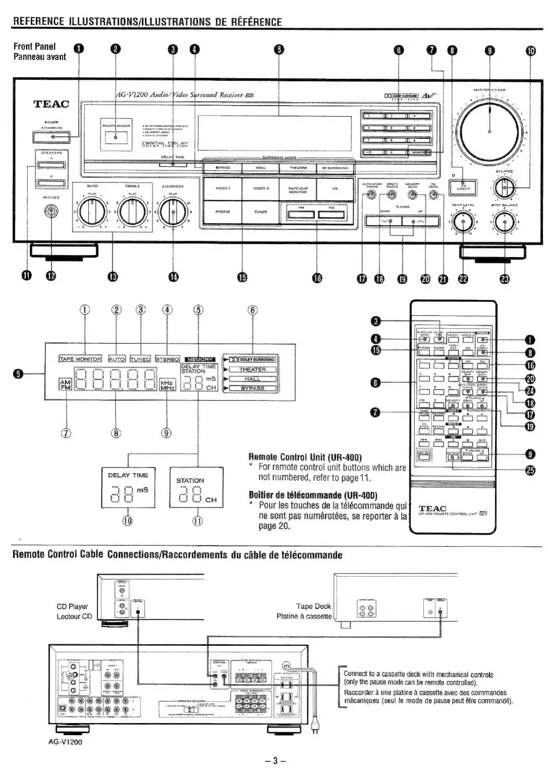 Teac AG-V1200 - Reference Illustrations; Front Panel Layout; Remote Control Unit Overview; Remote Control Cable Connections