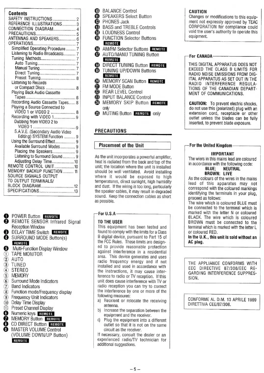 Teac AG-V1200 - Precautions; Unit Placement and Environment; Remote Control Unit Operation; Remote Control Functions and Buttons