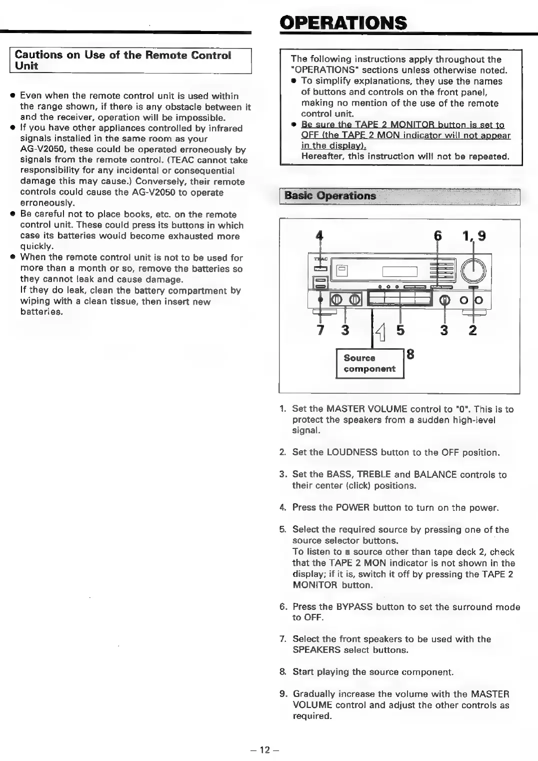 Teac AG-V2050 - Basic Operations; Cautions on Use of the Remote Control Unit