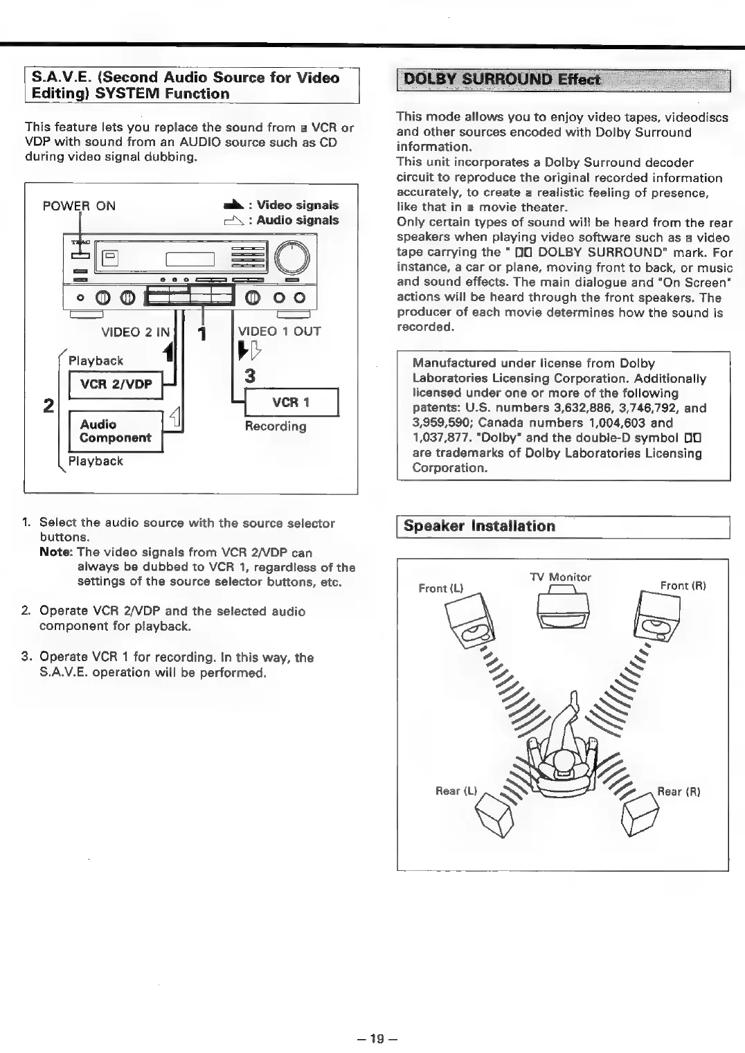 Teac AG-V2050 - DOLBY SURROUND Effect; Editing) SYSTEM Function; S.a.V.e; Speaker Installation