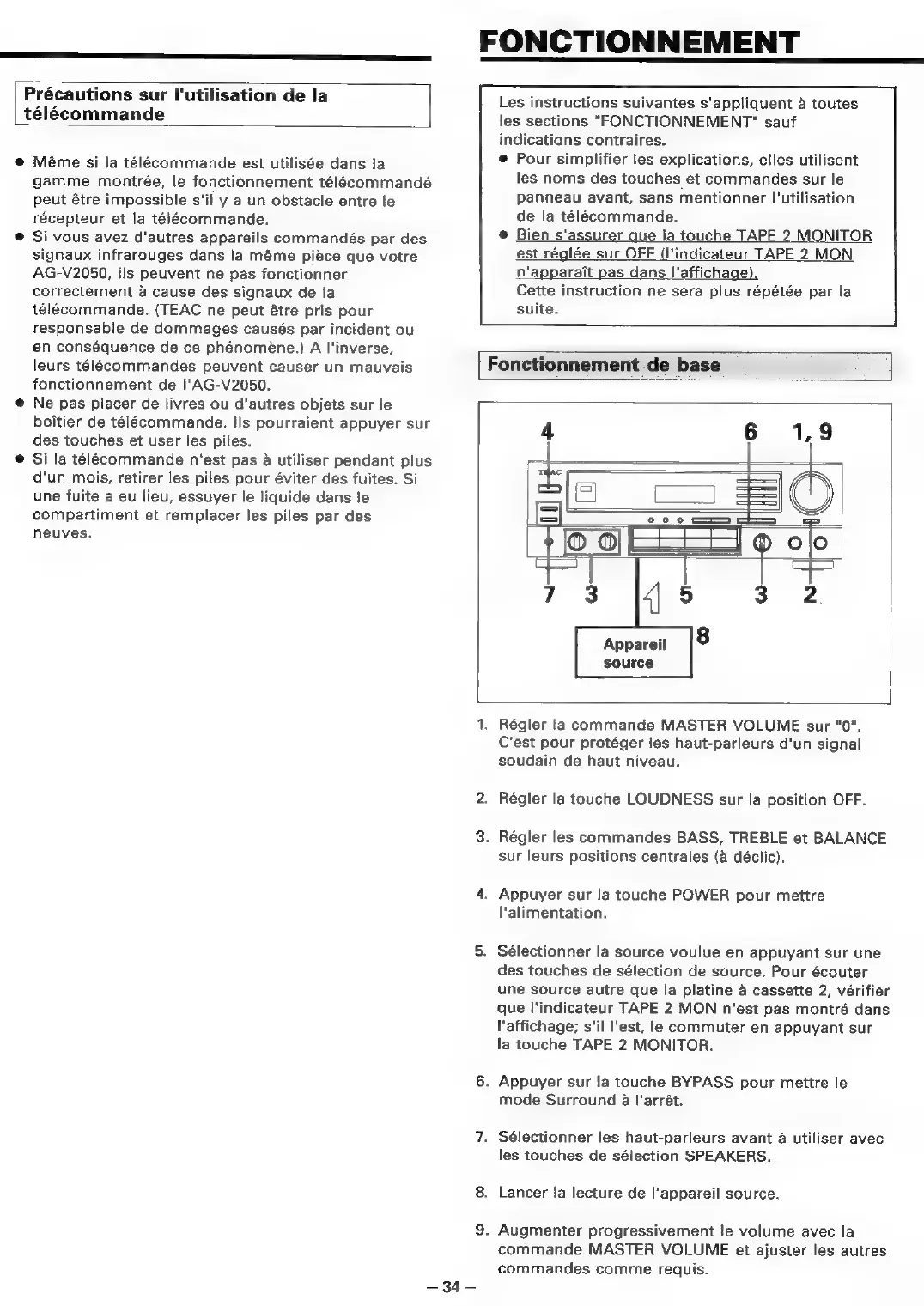 Teac AG-V2050 - Précautions Sur Lutilisation de la Télécommande; Fonctionnement; Fonctionnement de Base