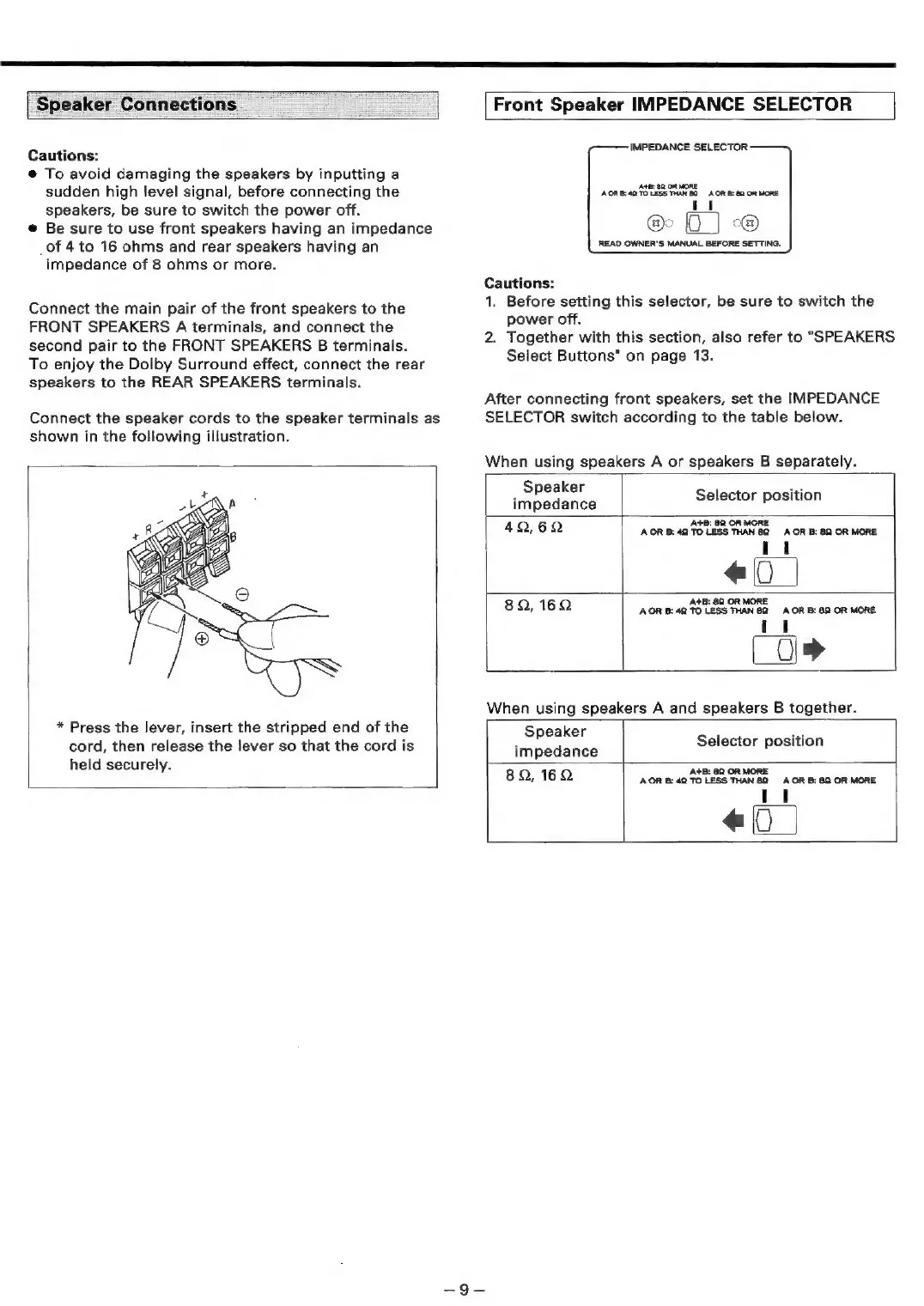 Teac AG-V2050 - Speaker Connections; Front Speaker IMPEDANCE SELECTOR
