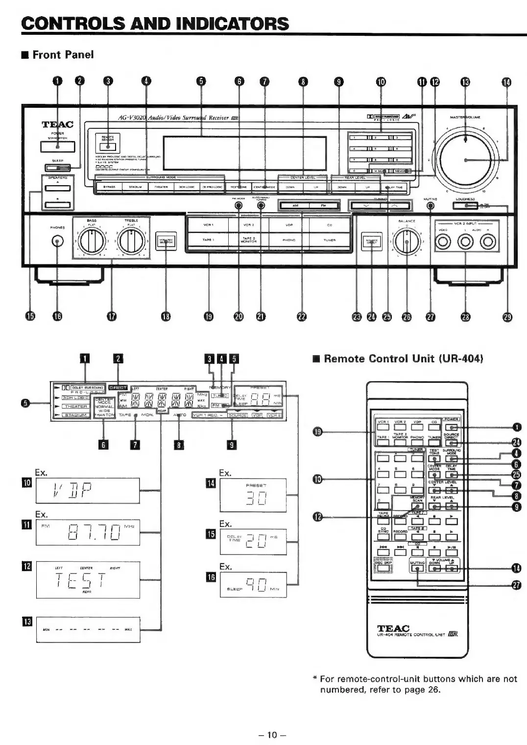 Teac AG-V3020 - Controls and Indicators; Front Panel Layout; Remote Control Unit (UR-404)