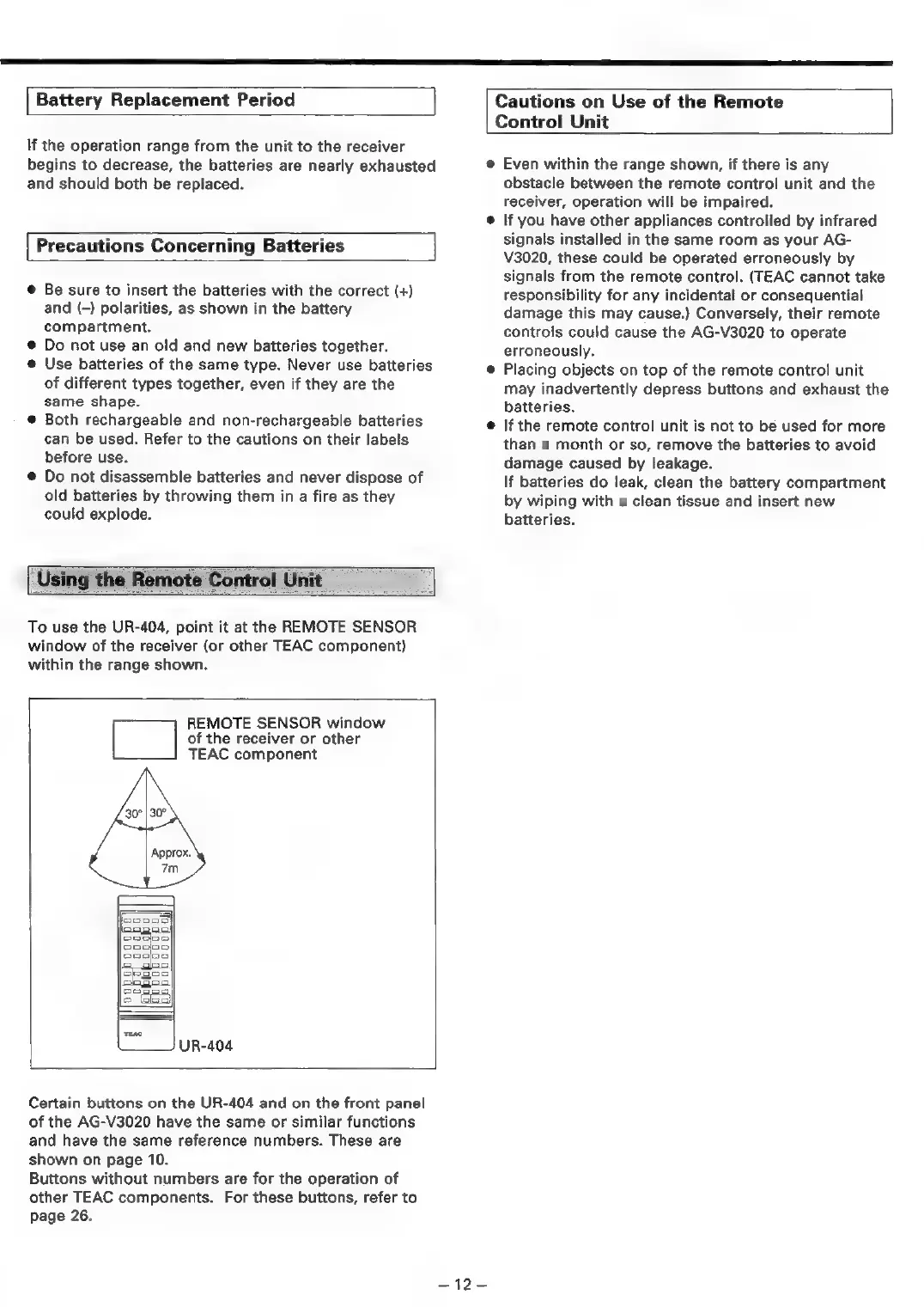 Teac AG-V3020 - Remote Control Unit Usage; Battery Replacement Period; Precautions Concerning Batteries; Using the Remote Control Unit