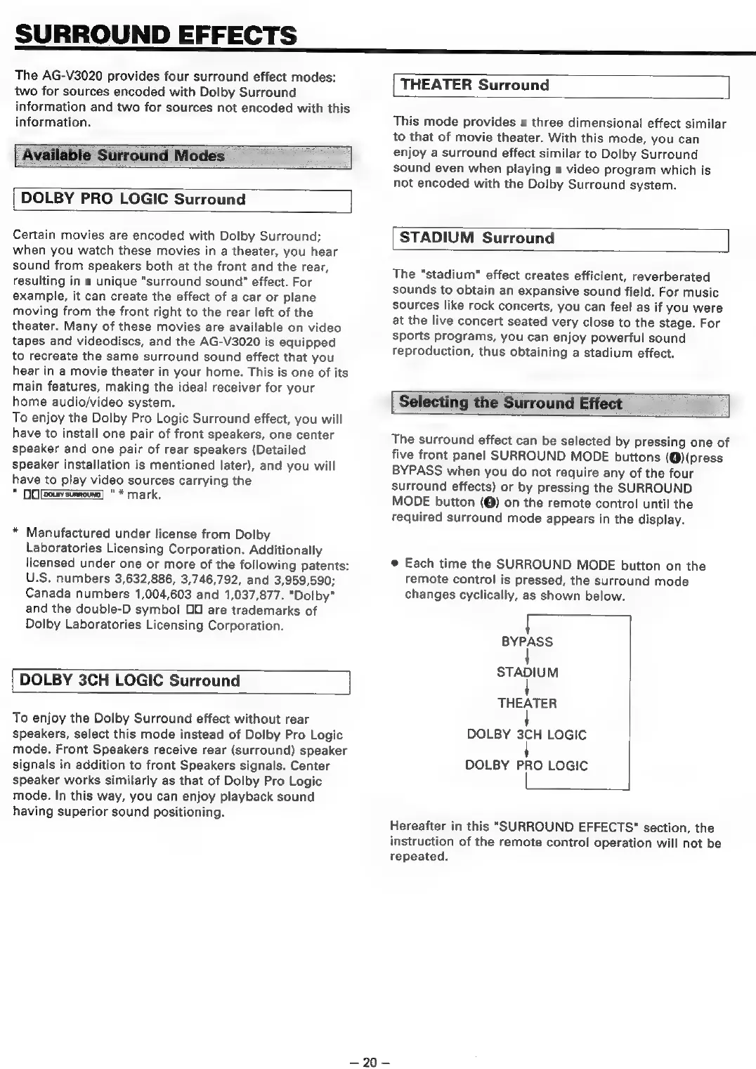 Teac AG-V3020 - Surround Effects; Available Surround Modes; Selecting the Surround Effect