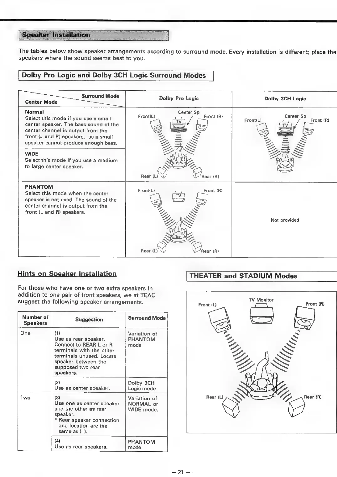 Teac AG-V3020 - Speaker Installation; Dolby Pro Logic and Dolby 3 CH Logic Modes; Hints on Speaker Installation; THEATER and STADIUM Modes