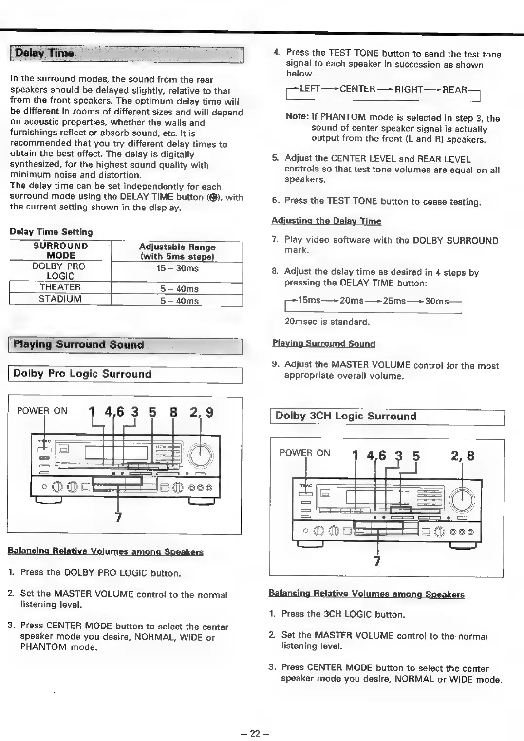 Teac AG-V3020 - Surround Sound Setup; Delay Time; Playing Surround Sound