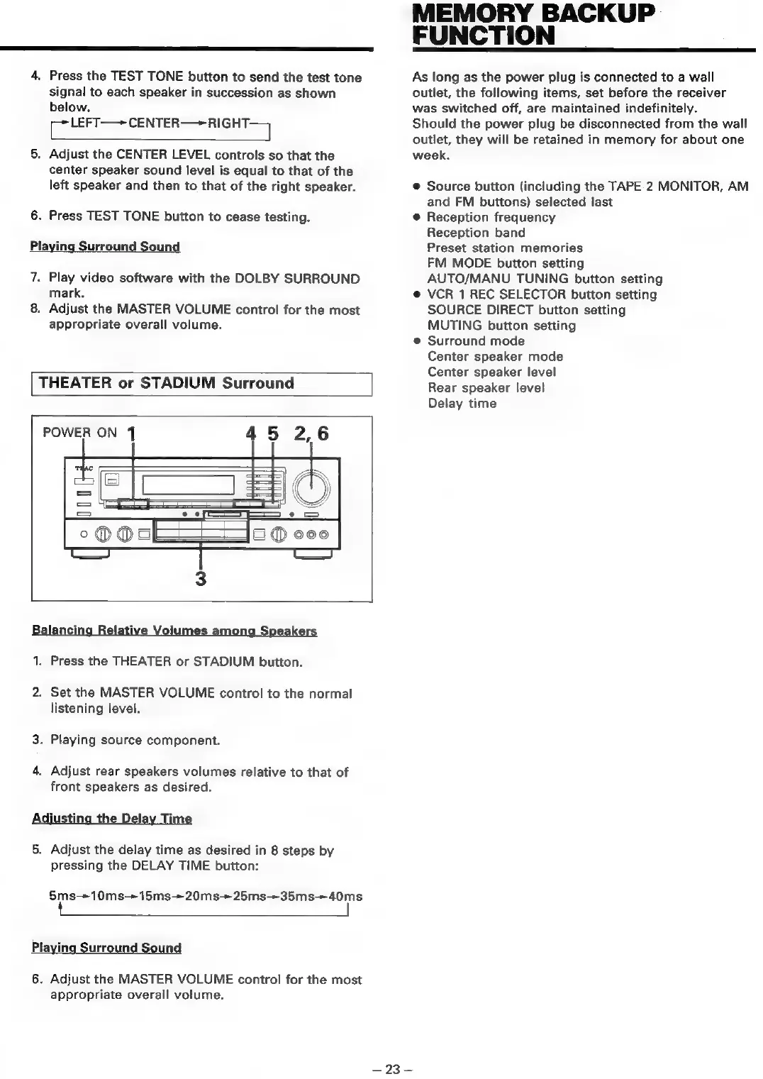 Teac AG-V3020 - THEATER and STADIUM Surround; Balancing Speaker Volumes; Adjusting Delay Time; Memory Backup Function