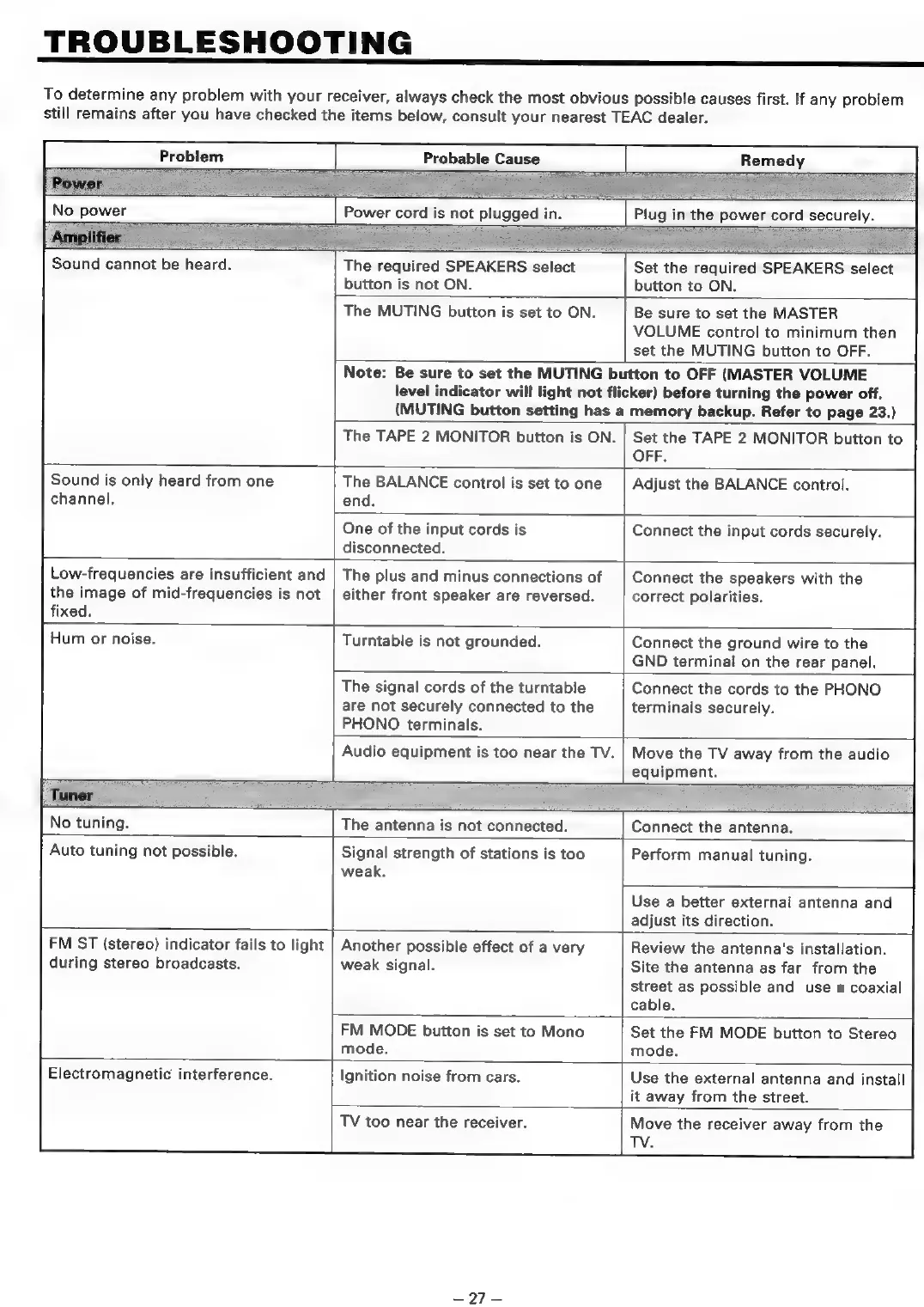 Teac AG-V3020 - Troubleshooting; Power and Amplifier Issues; Tuner Problems