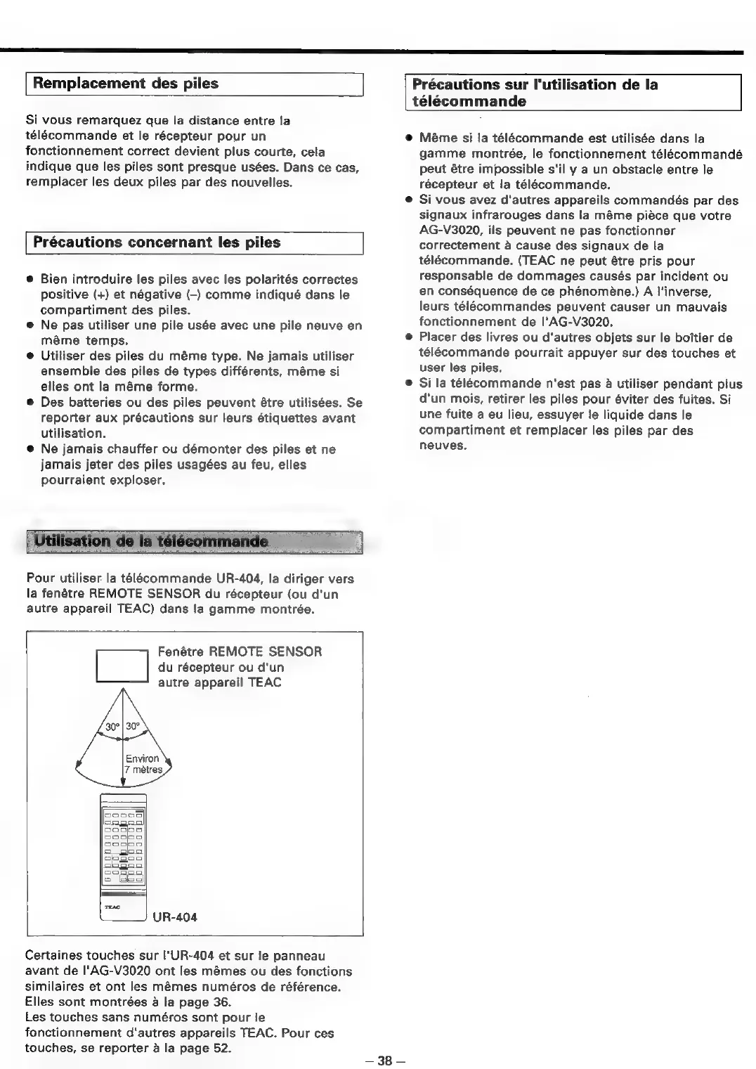 Teac AG-V3020 - Remplacement des Piles; Précautions Concernant les Piles; Précautions Sur Lutilisation de la Télécommande