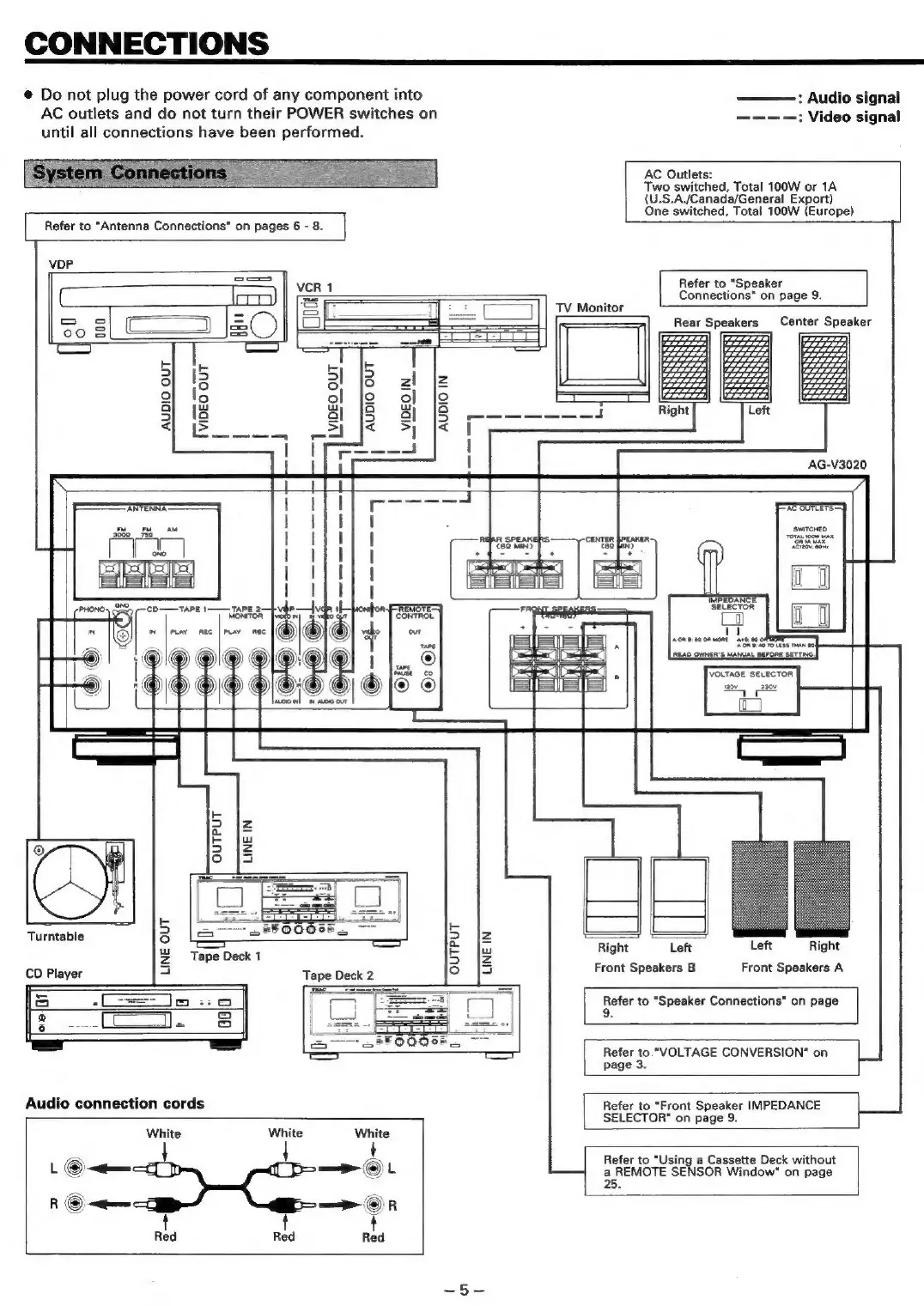 Teac AG-V3020 - Connections; System Connections Overview; Audio Component Wiring; Speaker Setup and Impedance