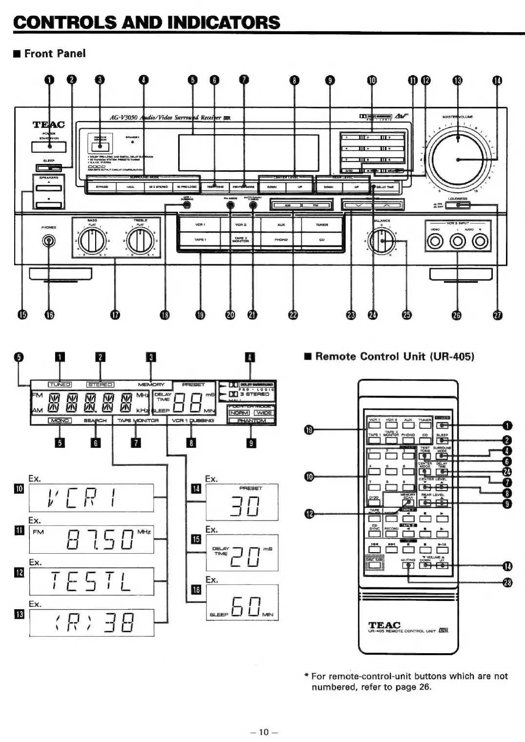 Teac AG-V3050 - CONTROLS AND INDICATORS; Front Panel Controls and Displays; Remote Control Unit Layout