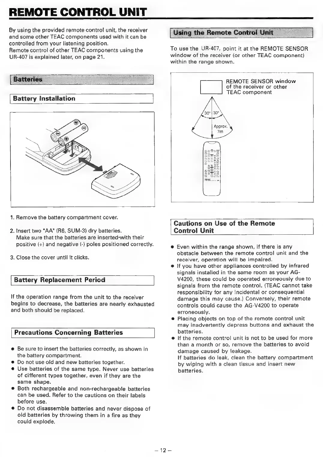 Teac AG-V4200 - Batteries; Cautions on Use of the Remote Control Unit