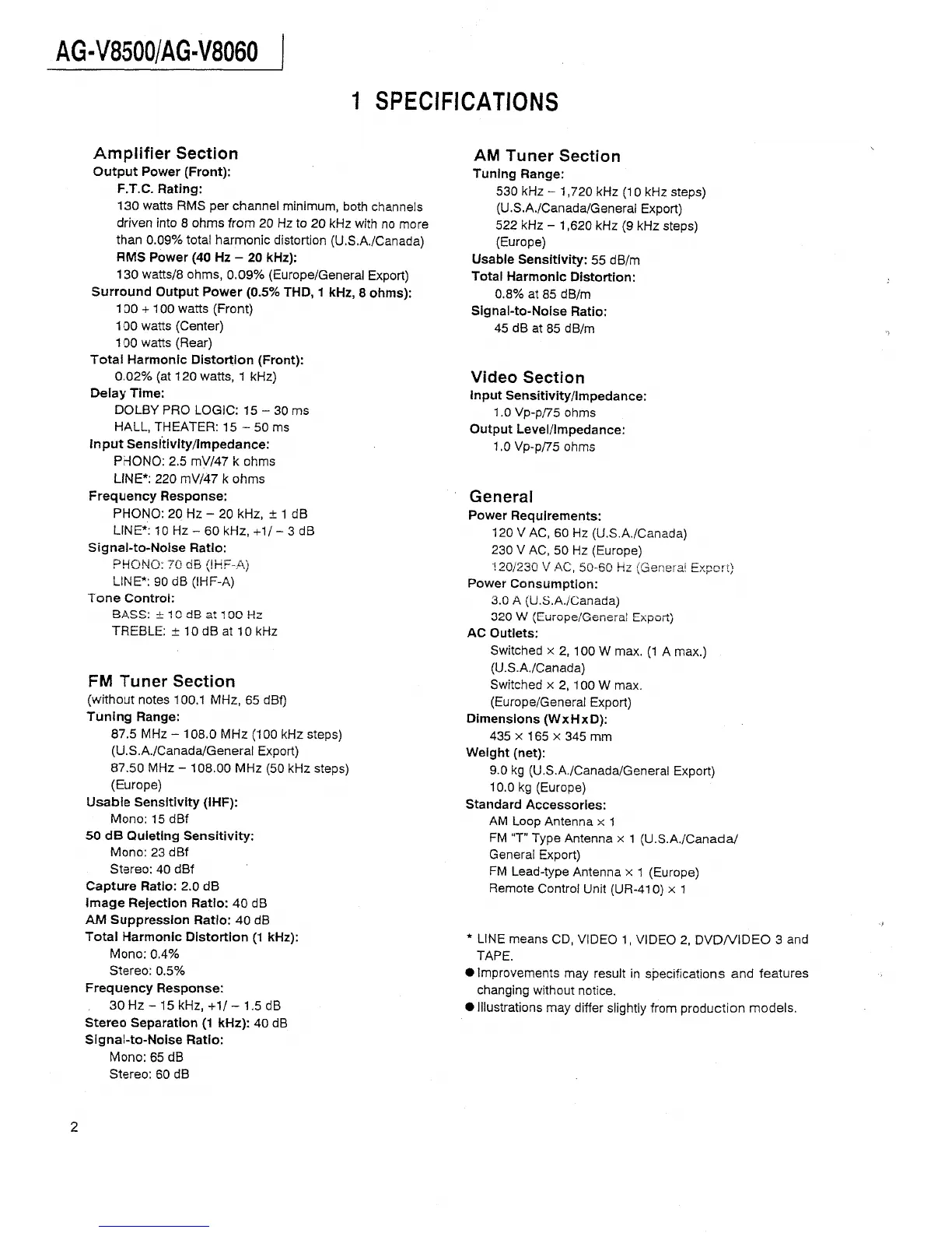 Teac AG-V8500 - Specifications Overview; Amplifier Section Specifications; Tuner Section Specifications; Video and General Specifications