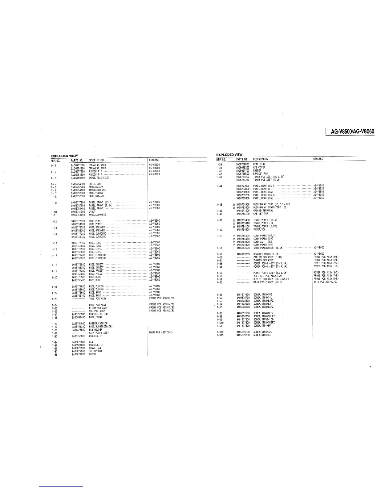 Teac AG-V8500 - Detailed Component Parts Listing