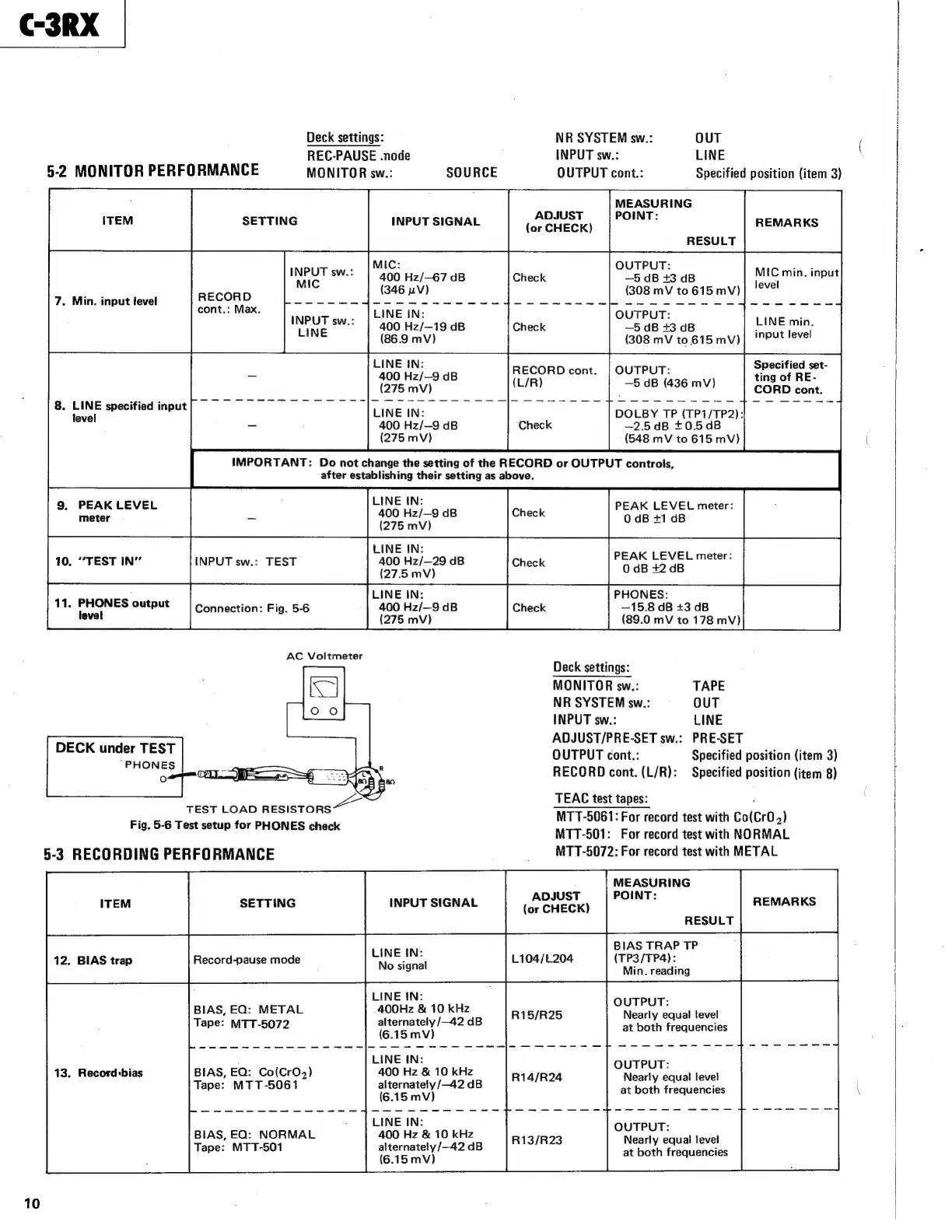 Teac C-3RX - Monitor and Recording Performance Checks