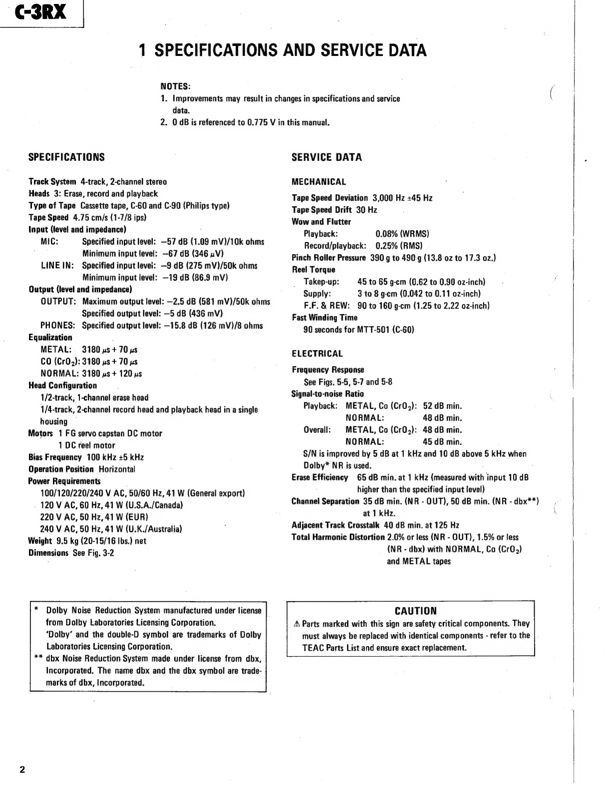 Teac C-3RX - 1 Specifications and Service Data; Notes and Important Information; Detailed Technical Specifications; Service Performance Parameters