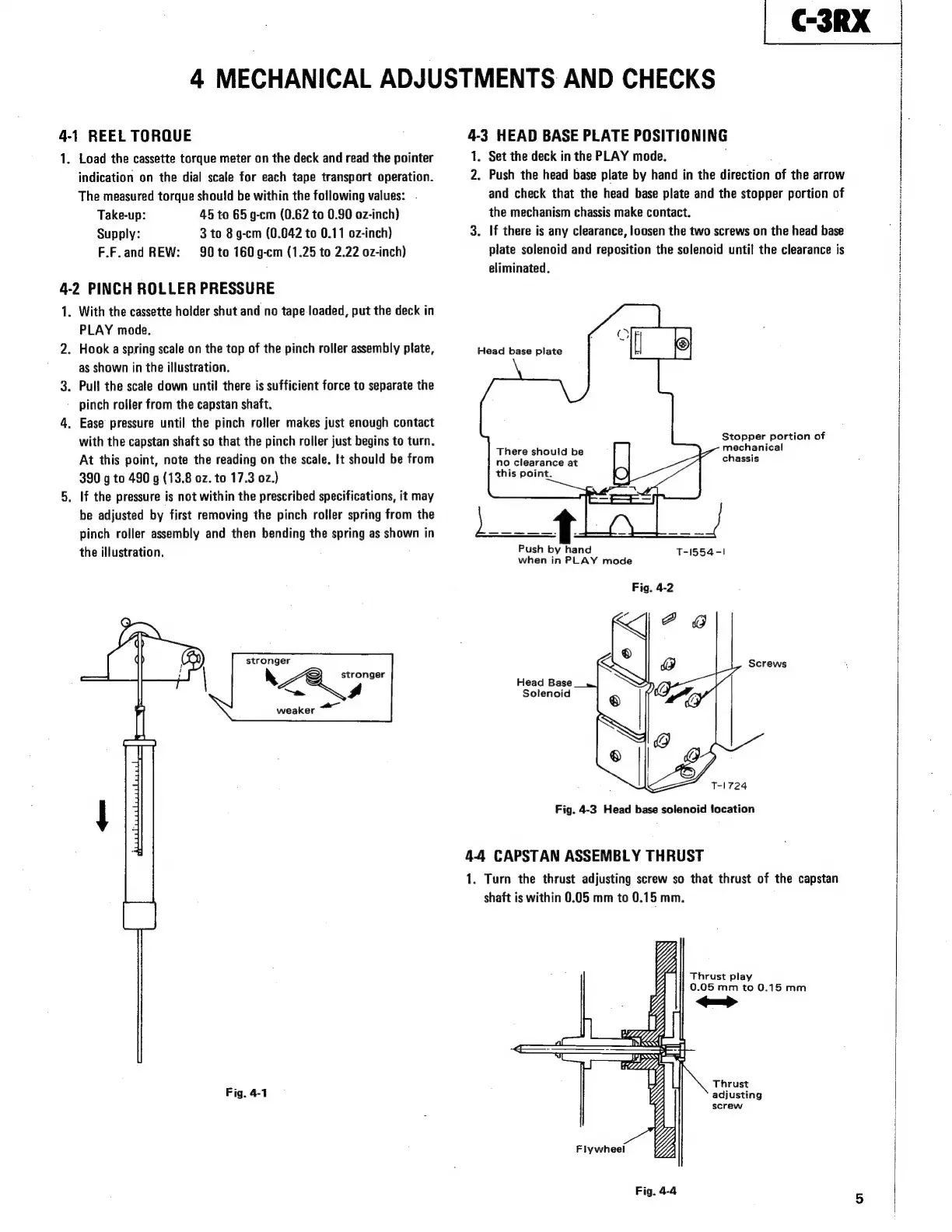 Teac C-3RX - 4 Mechanical Adjustments and Checks; Reel Torque and Pinch Roller Adjustments; Head Base Plate and Capstan Thrust