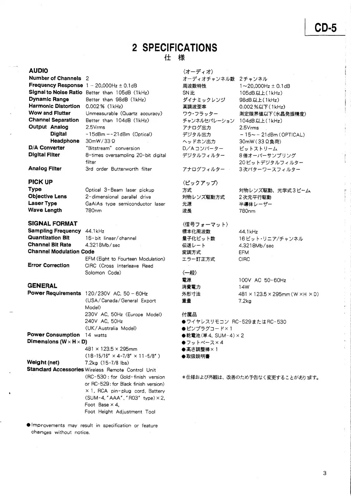 Teac CD-5 - SPECIFICATIONS; AUDIO SPECIFICATIONS; PICK UP SPECIFICATIONS; SIGNAL FORMAT SPECIFICATIONS