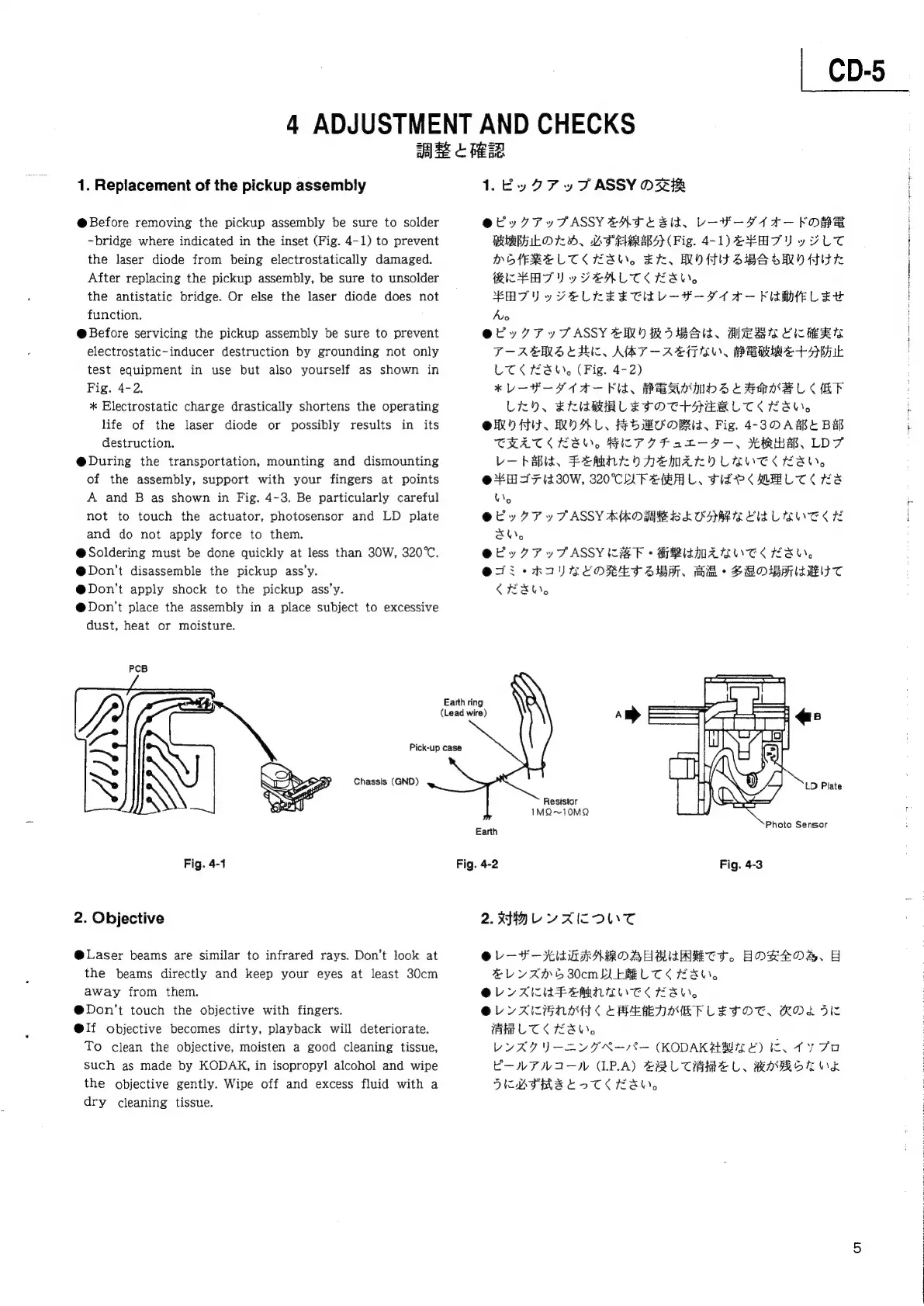 Teac CD-5 - ADJUSTMENT AND CHECKS; Pickup Replacement and Safety