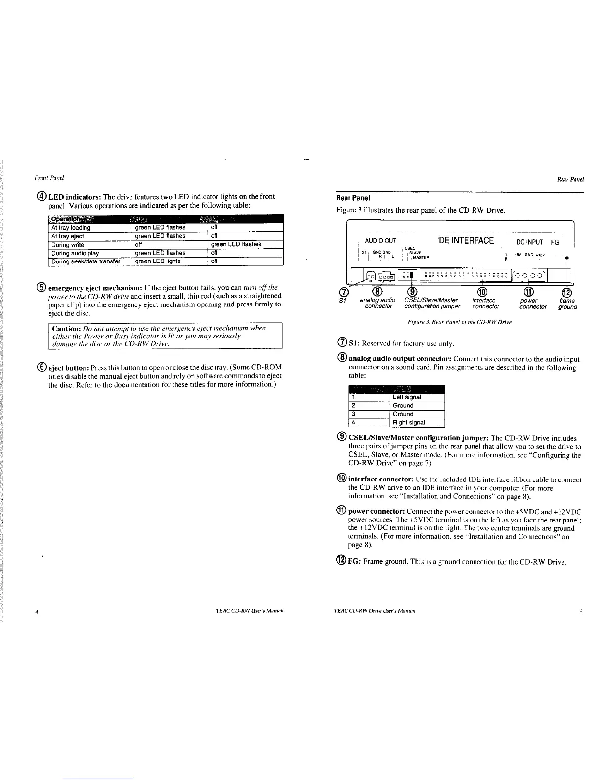 Teac CD-W54E - Rear Panel; LED Indicators; Emergency Eject Mechanism; Eject Button
