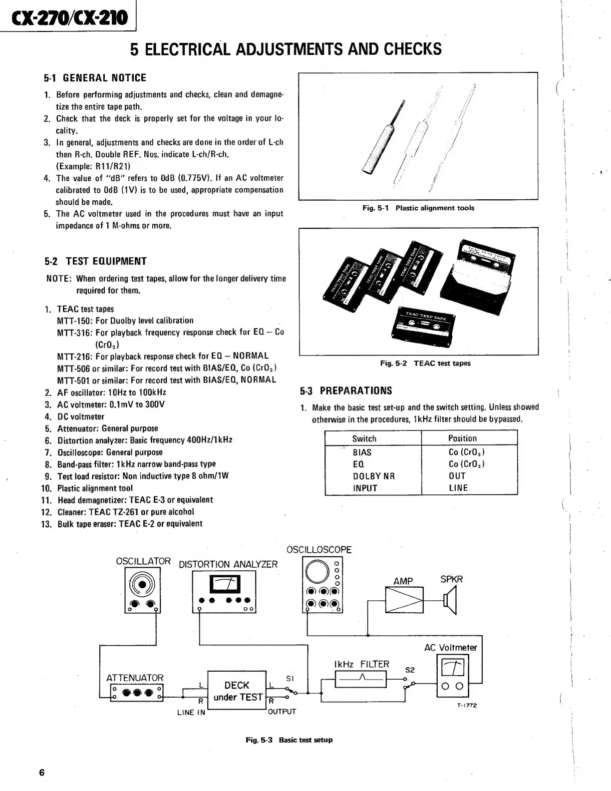 Teac CX-270 - Electrical Adjustments and Checks; General Notices; Required Test Equipment; Test Setup Preparations