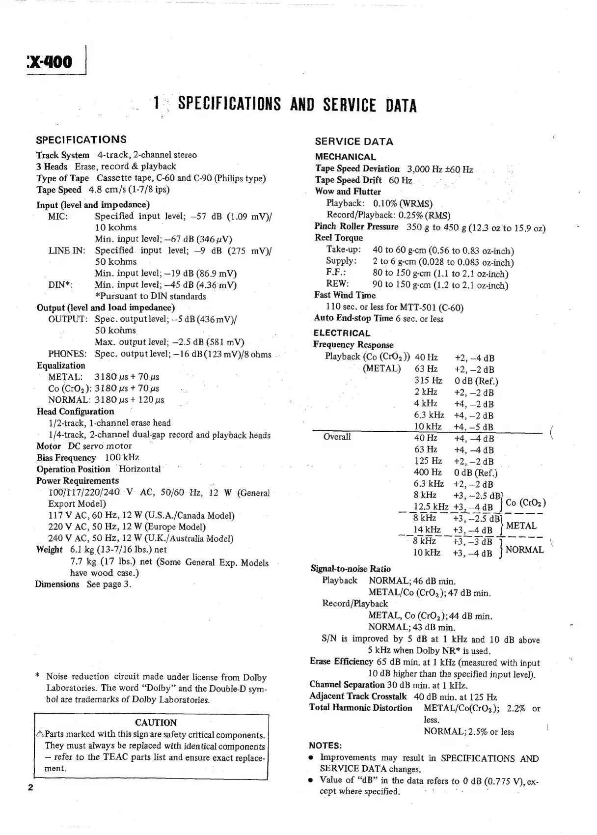 Teac CX-400 - SPECIFICATIONS AND SERVICE DATA; SPECIFICATIONS; SERVICE DATA