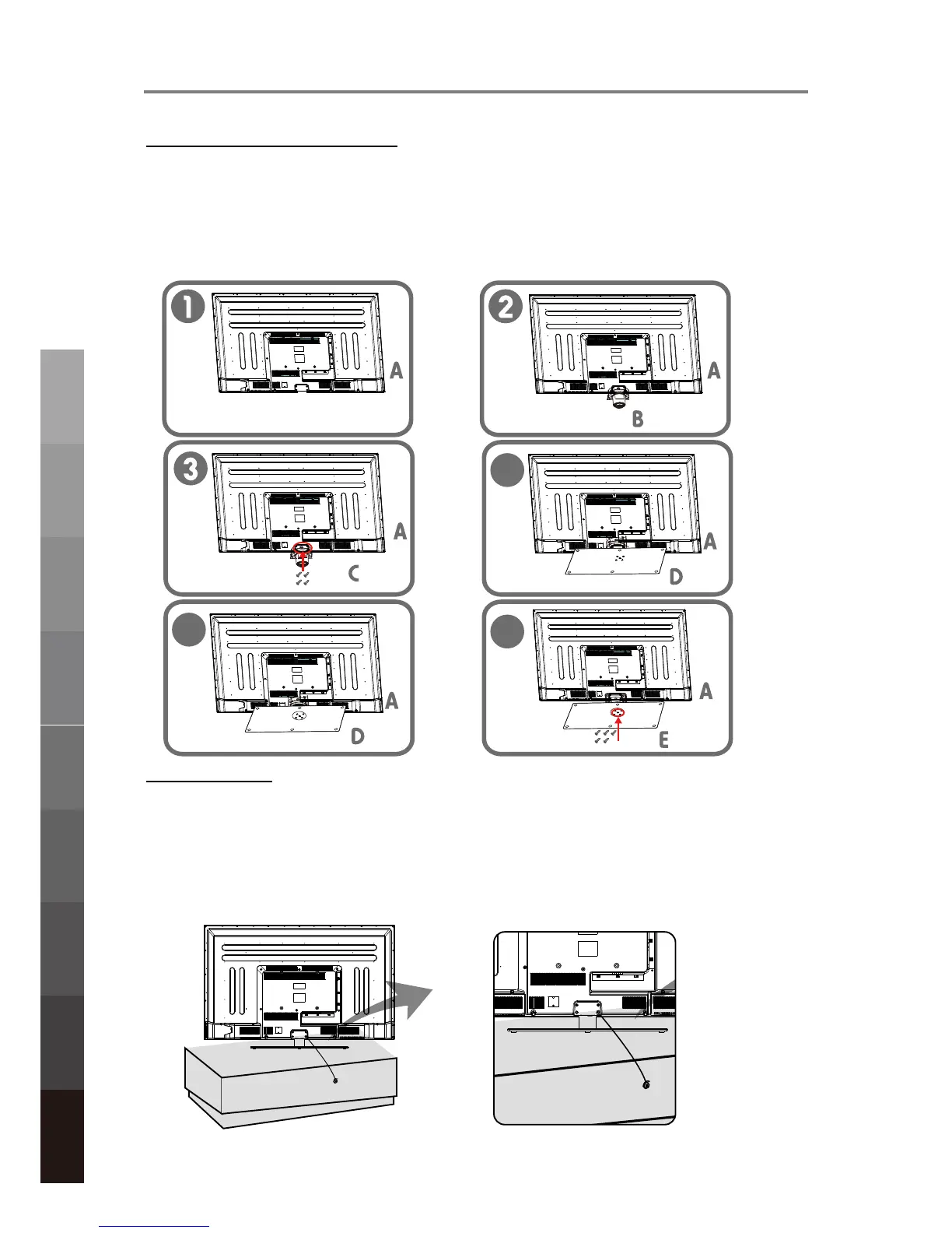 secure the TV to your table or wall using screws or eyebolts and strong cord (not provided).