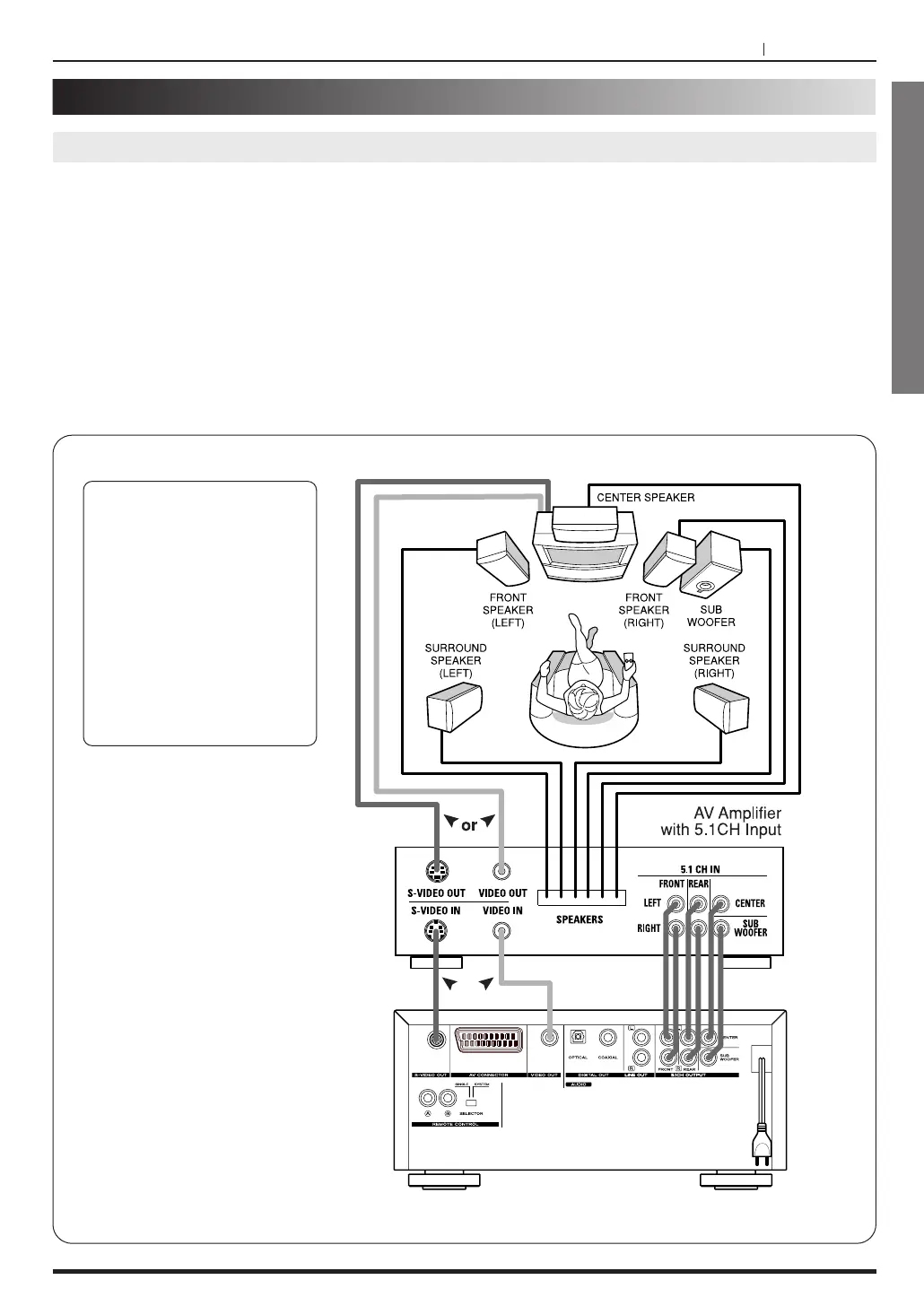 Connect an amplifier with 5.1 channel inputs to the player and to the speakers. See the figure below.