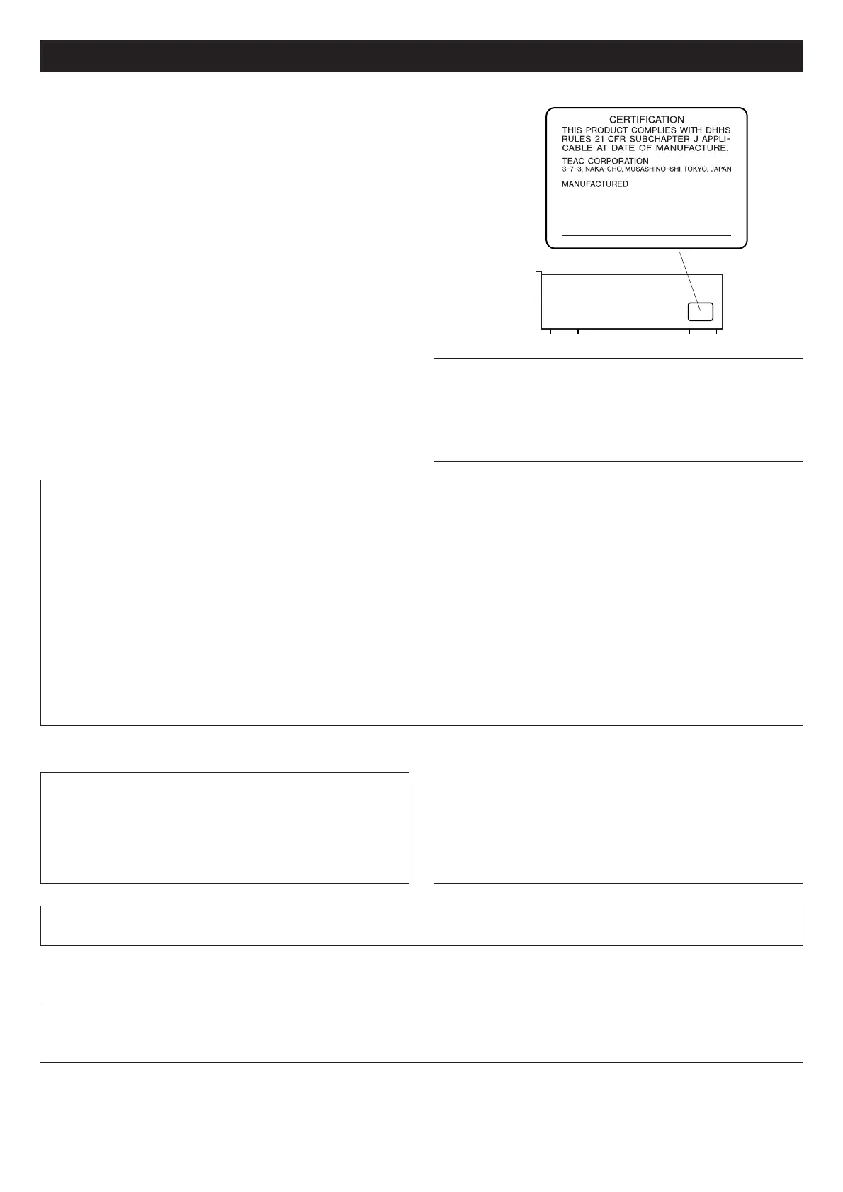 Changes or modifications to this equipment not expressly approved by TEAC CORPORATION for compliance could void the user's authority