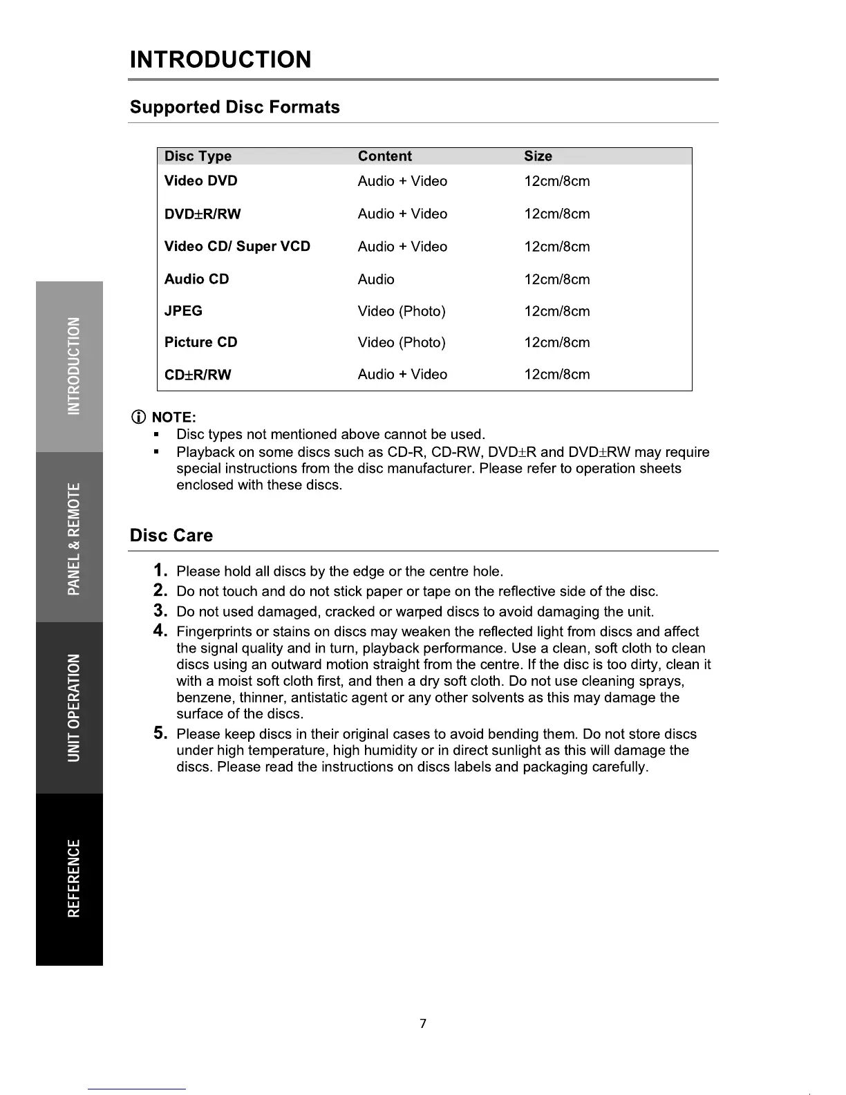 Teac DVP902T - Supported Disc Formats; Disc Care