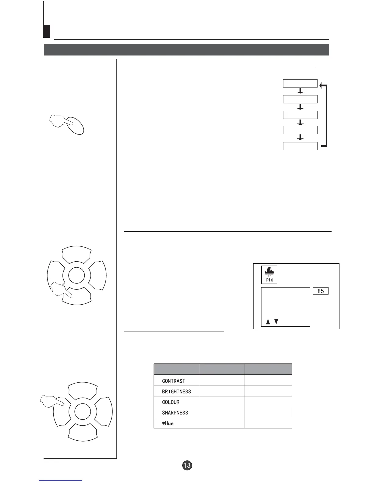 Note:The "Hue" item only appears when the colour system is NTSC.