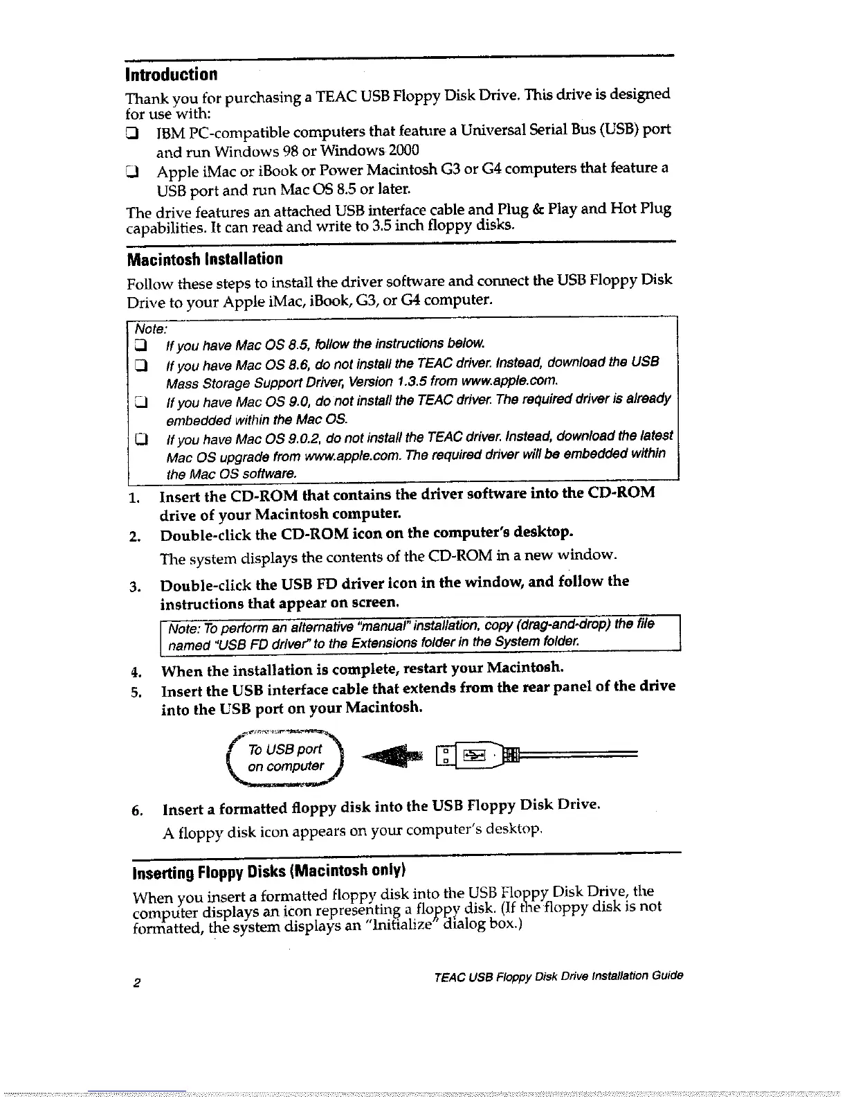 Teac FD05PUB - Introduction; Macintosh Installation Guide; Inserting Floppy Disks (Macintosh)