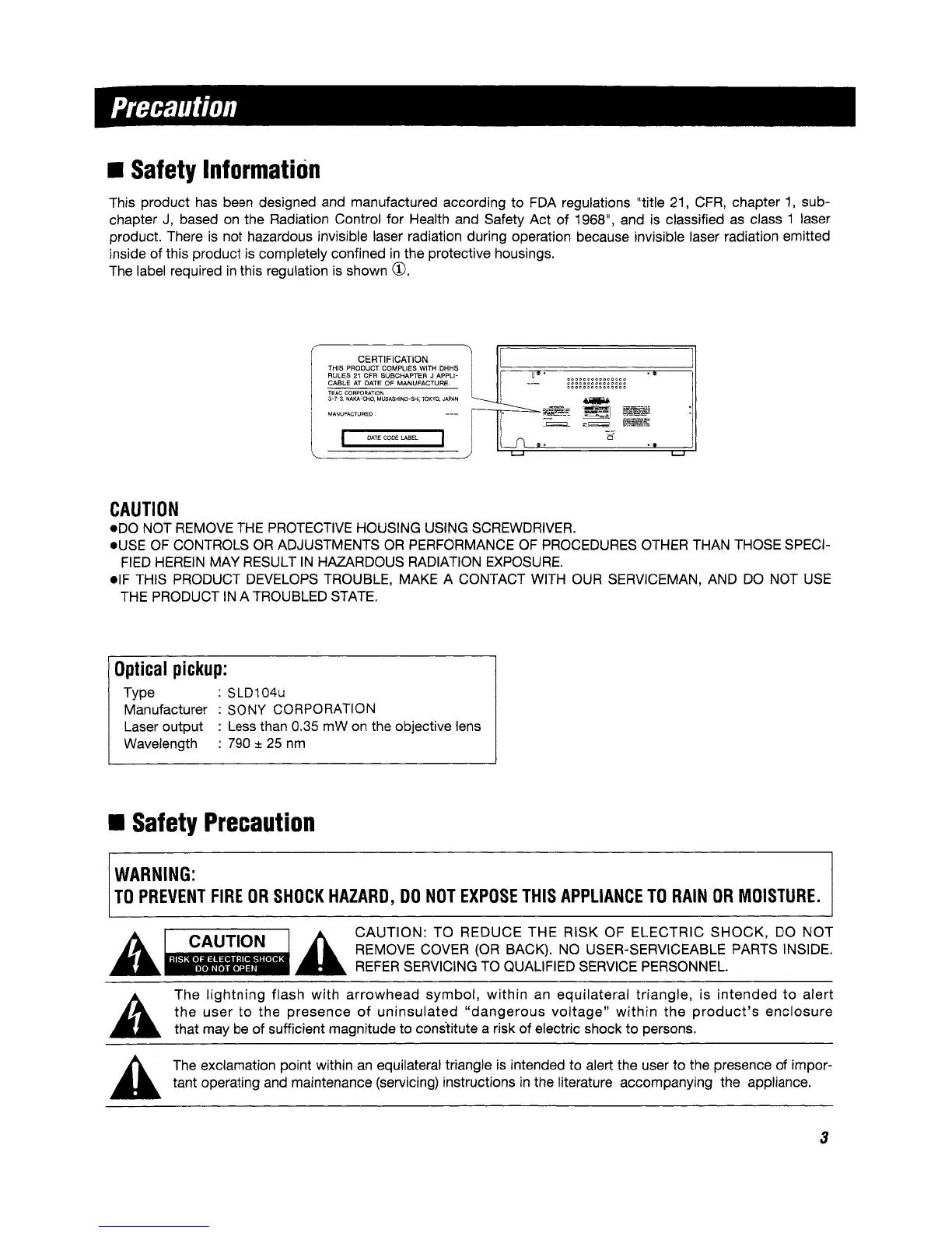 Teac GF-330 - Precautions; Laser Safety Information; Operational Safety Warnings