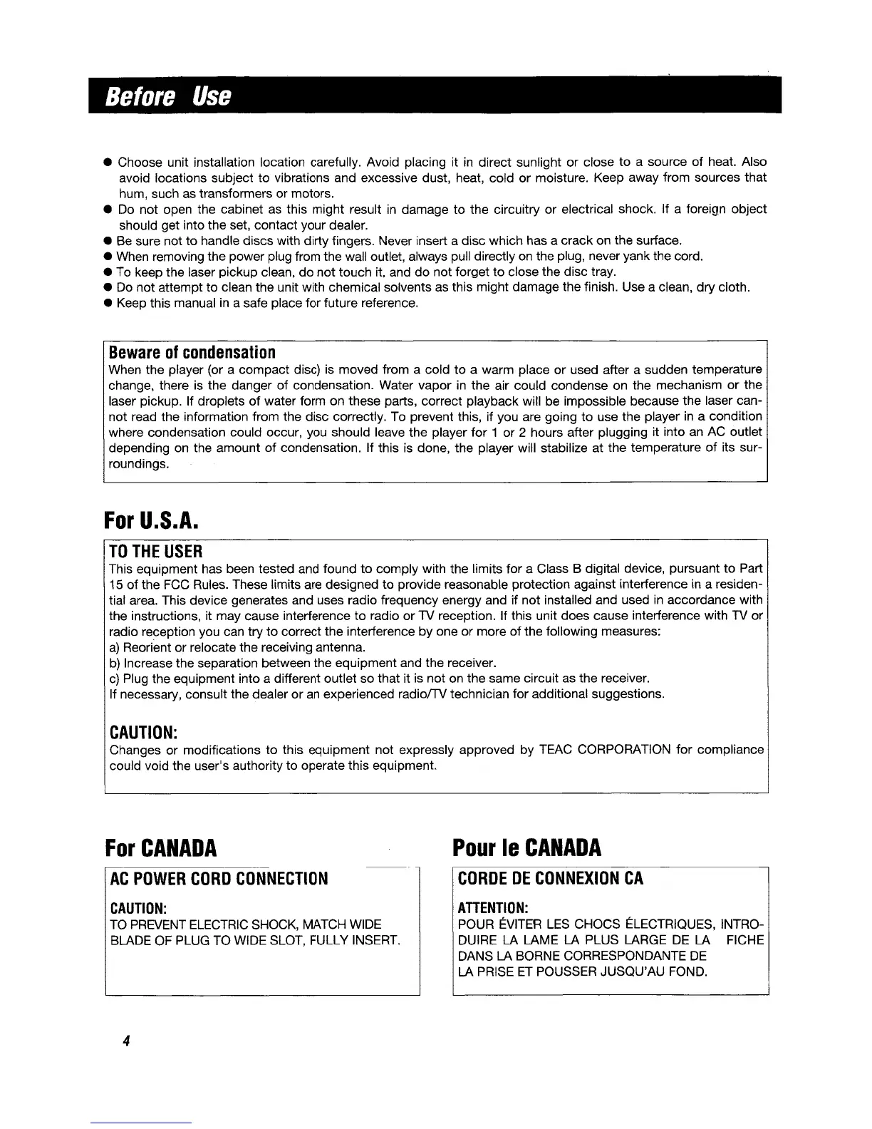 Teac GF-330 - Before Use; Installation and Handling; Condensation Management