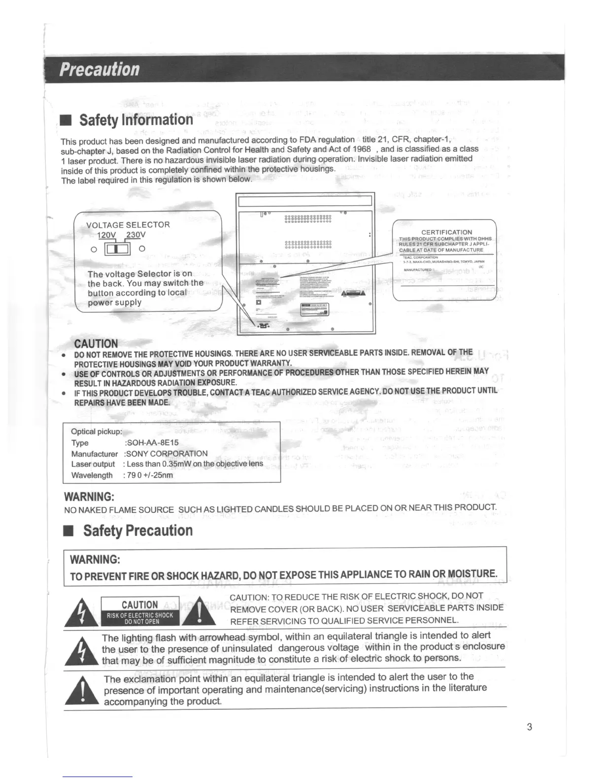 Teac GF-480 - Product Precautions and Safety; Safety Information and Compliance; Electrical and Environmental Safety