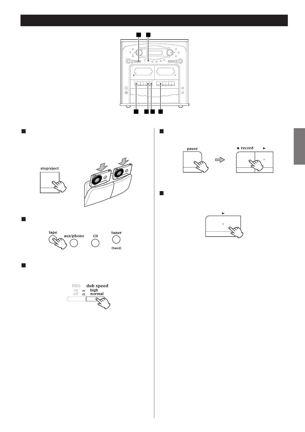 Press the PAUSE button and the RECORD button of TAPE @.